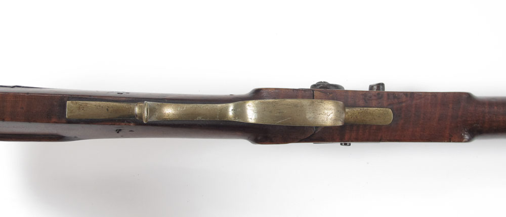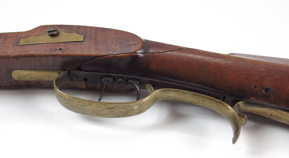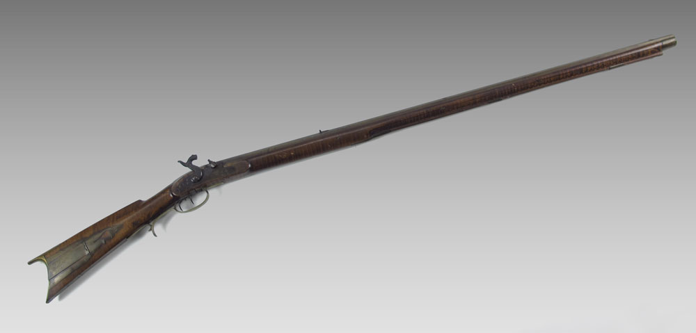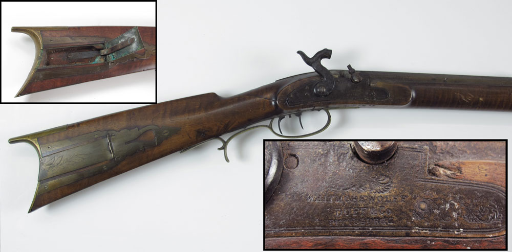 1850'S SIGNED FULL STOCK PENNSYLVANIA RIFLE: 39 1/4'' octagon barrel signed J.H.. Percussion lockplate marked Whitmore, Wolff, Duff & Co. Pittsburg. Full stock with brass furniture, engraved patchbox cover and engraved design on forestock. 55'' overall.