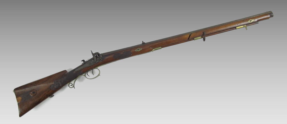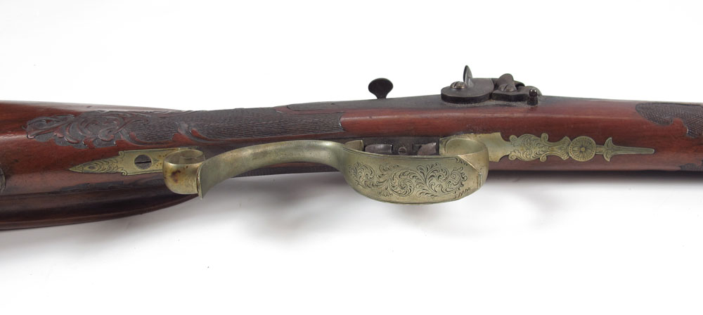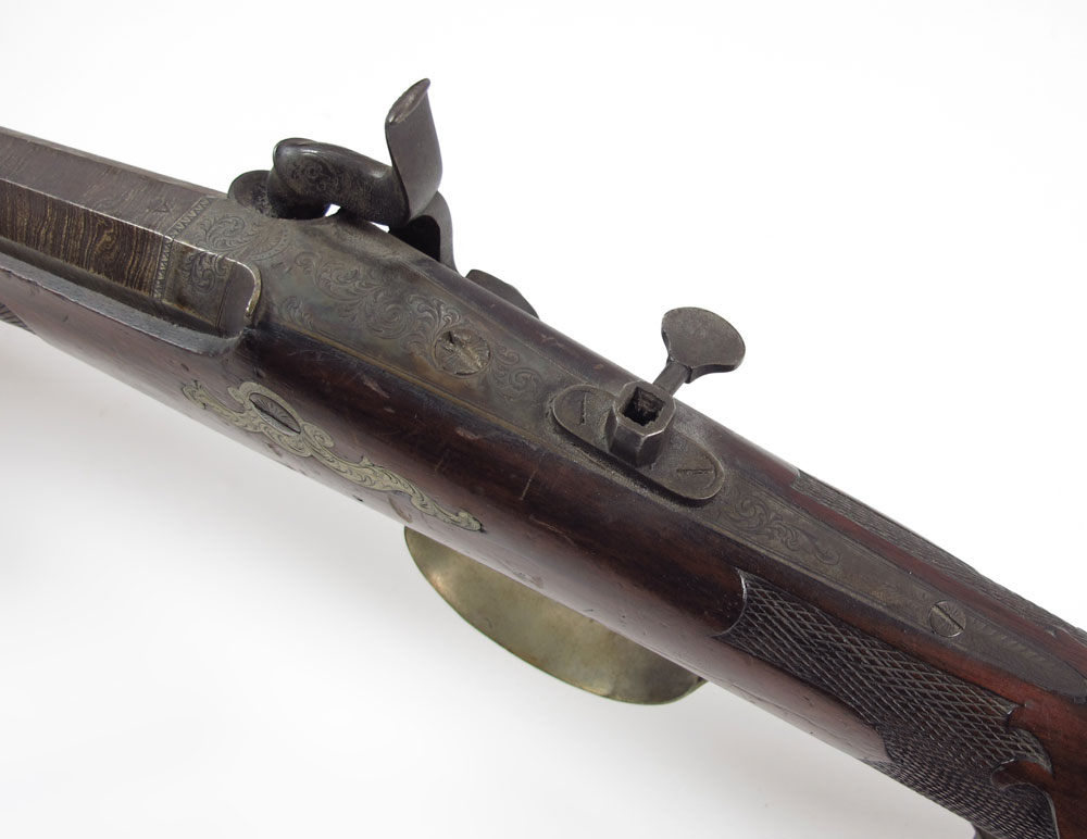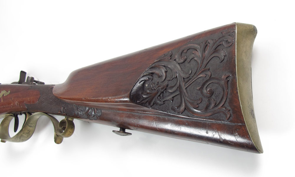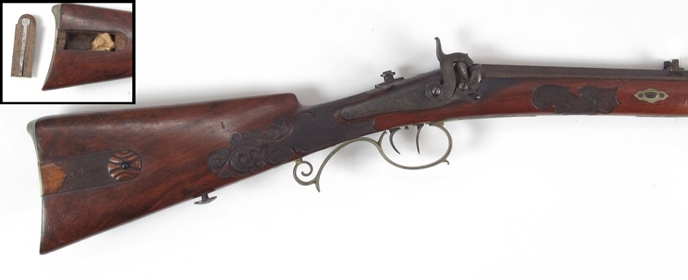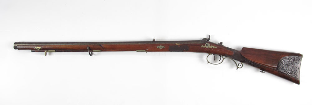 19TH CENTURY FISCHER GERMAN TARGET RIFLE: 31'' octagon watered steel barrel marked Fischer & Son in Mehlis with engraved tang, crown over V proof stamp. Intricately carved full stock with brass furniture. Site mount on tang, missing site. Action works. 47 1/2'' long overall.