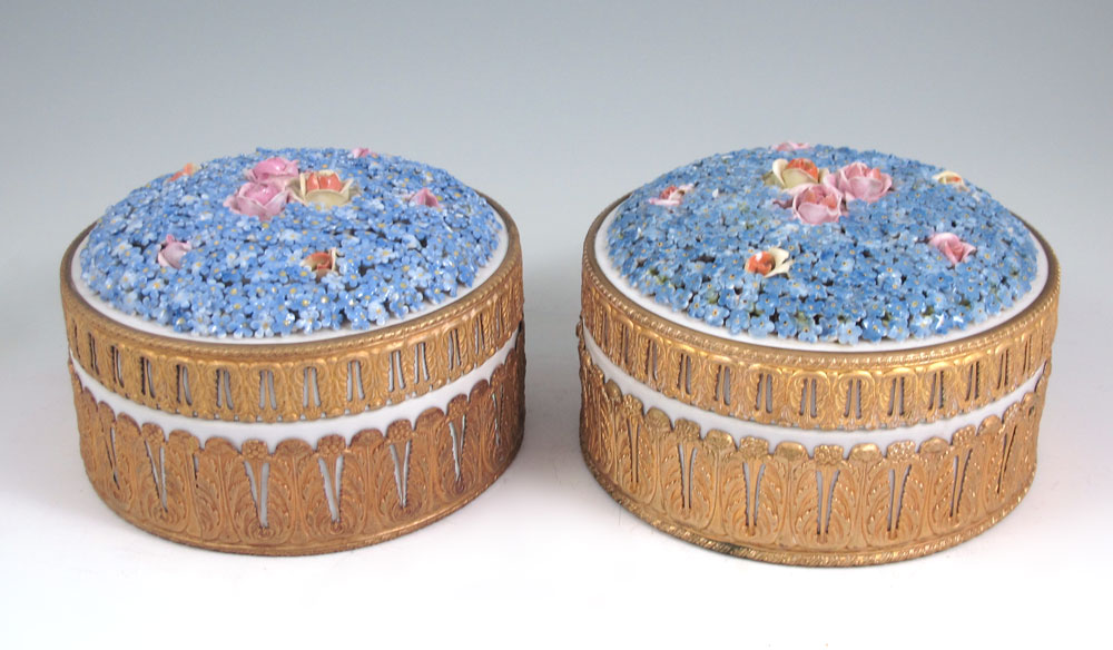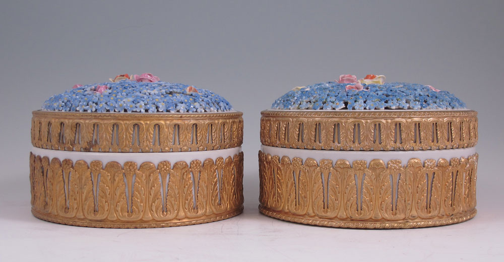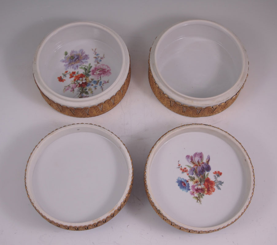 PAIR MEISSEN PORCELAIN DRESSER BOXES: Gilt metal mounted covered boxes, the lids encrusted in flowers, the interiors are handpainted. Marked Germany under glaze. Approx. 4'' tall. 6'' dia.
