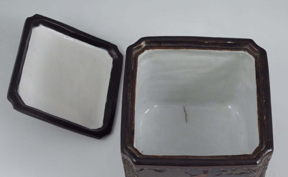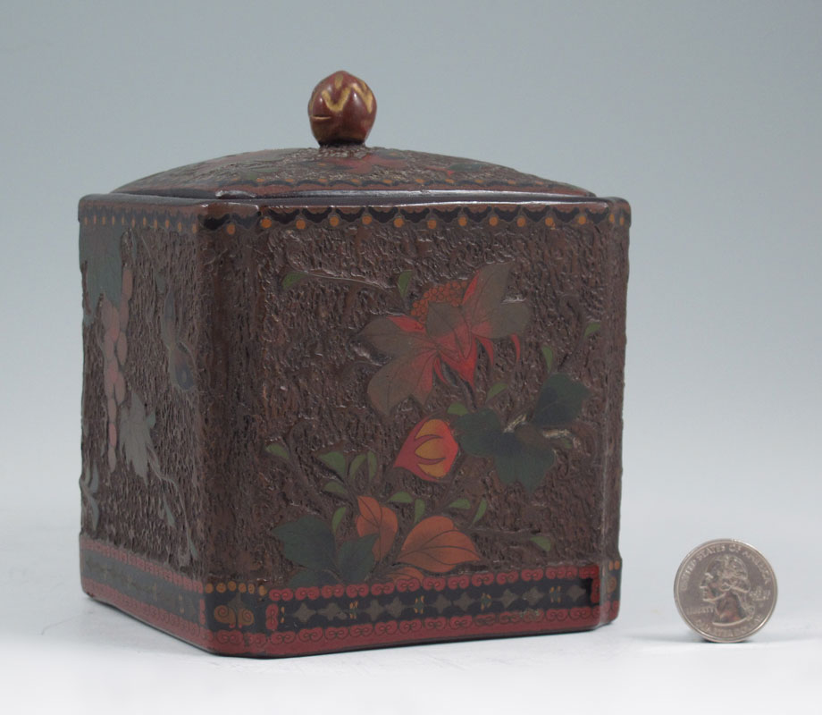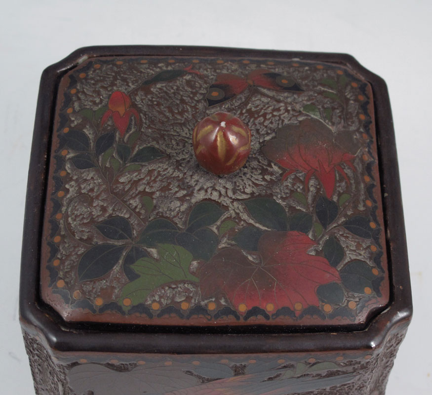UNUSUAL JAPANESE TOTAI TREE BARK CLOISONNE COVERED BOX: Enamel cloisonne on ceramic body, bird in a grape vine design, 5 1/4'' h. x 4 1/4'' x 4 1/4''.