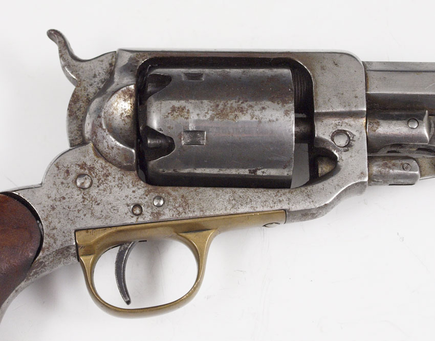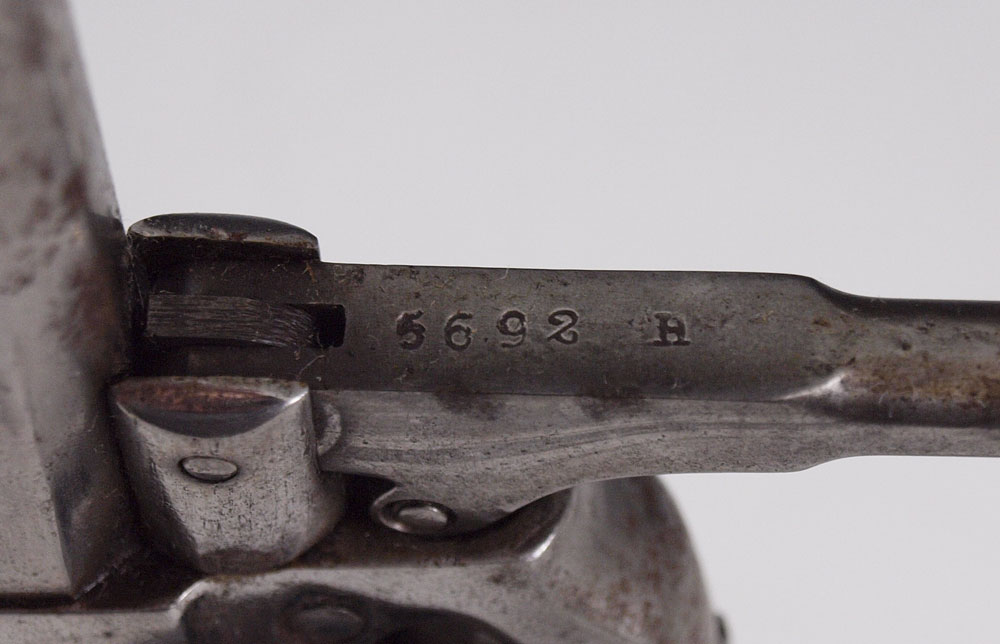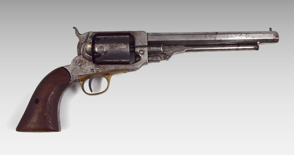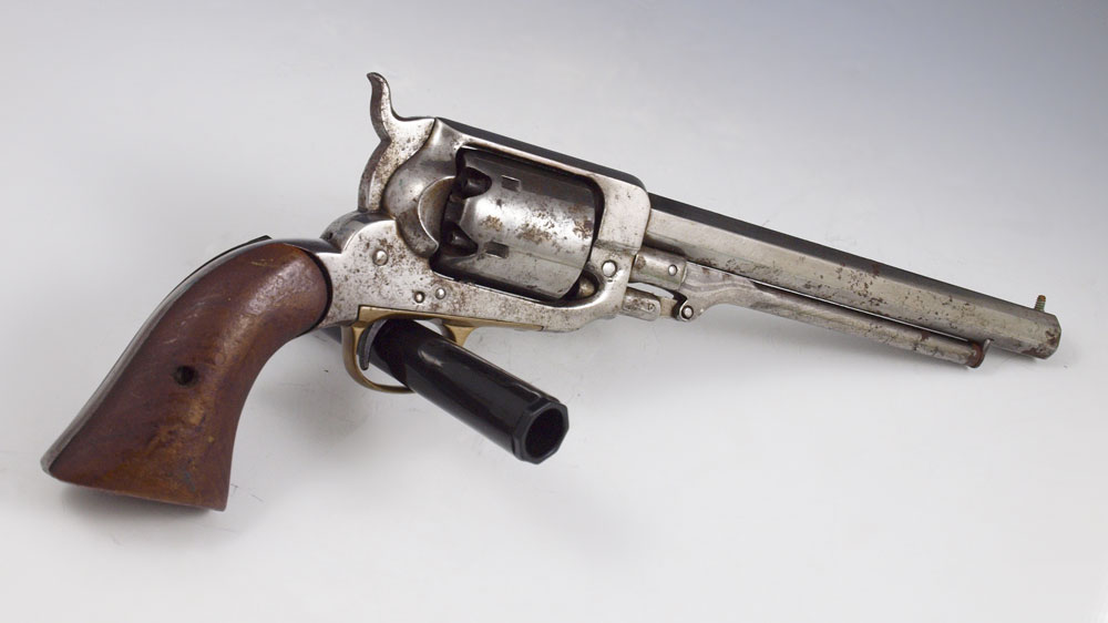 WHITNEY SECOND MODEL NAVY PERCUSSION REVOLVER: Popular in the Civil War, .36 caliber six shot, serial number 5692, 2nd type. Wood grips, this model has been cleaned and renickeled leaving no other markings. 7 1/2'' barrel octagon barrel. Action works. 12 1/2'' overall.