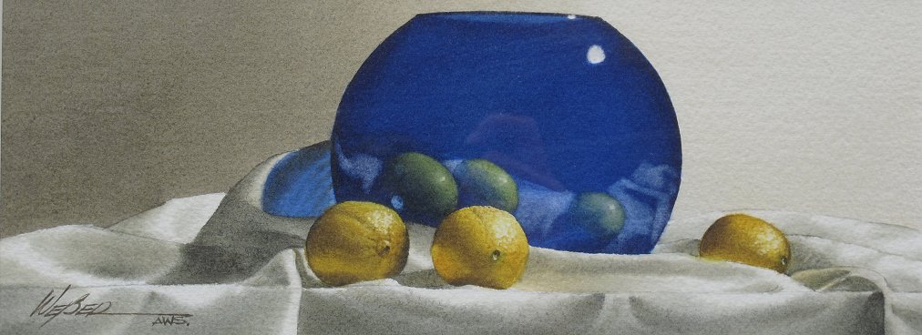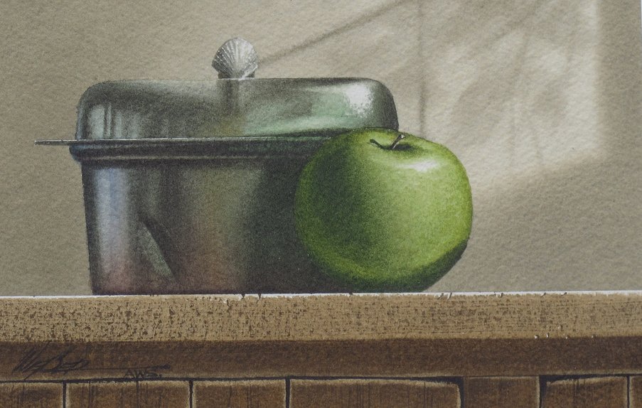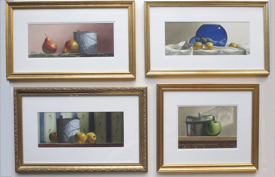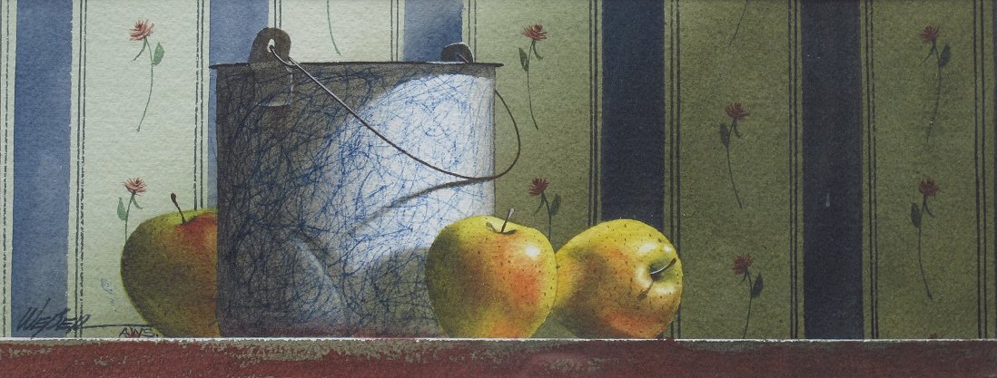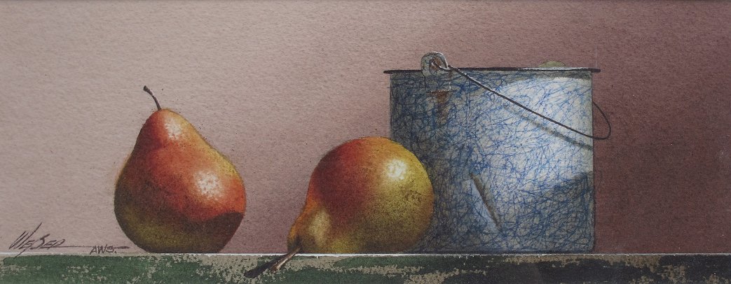 WEBBER, Michael, (American, 20th Century): 4pc Watercolor lot to include 1) Granny Smith and Pewter, sight size 6'' x 9'', signed lower left, titled verso, gilded frame, 12 1/2'' x 15 1/2''; 2) ''In Grandmas Kitchen'' still life of apples and an enameled tin pale, sight size 5'' x 13'', signed lower left, titled verso, framed, 13'' x 20''; 3) Still Life with Pears and Enameled Tin Pail, sight size 5'' x 13'', signed lower left, framed 11 1/2'' x 19 1/2''; 4) Key Limes and Cobalt Glass, sight size 5'' x 12 3/4'', framed, 11'' x 19''.