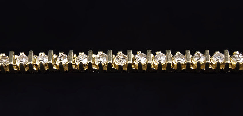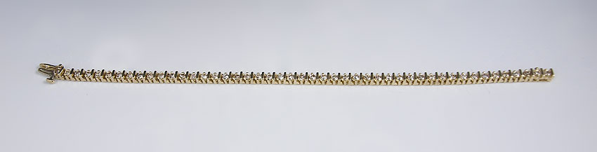 DIAMOND BAR STYLE TENNIS BRACELET: 14K yellow gold bracelet contains 47 round brilliant cut diamonds. Weight: 2.50 Ct. approx. Rated SI in clarity and I-J in color. The diamonds are prong set. Weight: 13.9 grams. Length: 7''