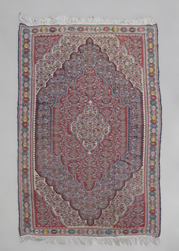 MODERN PERSIAN SENNA KILIM HAND WOVEN RUG,4' 2'' x 5' 11'': This finely woven reversible flat weave rug has a more curvilinear design than most kilims. That can only be achieved when the weave is finer than usual. The soft colors of pale red, aqua blue, white, yellow, beige and blue are used in a design that radiates out from a small central white ground medallion. Next is a red ground, then an aqua ground, then white again finally with red ground corners in the main field. The aqua ground main border has a ball like motif that uses all the colors that are found in the rest of the rug. Condition is very good although one side is not as vibrant as the other.