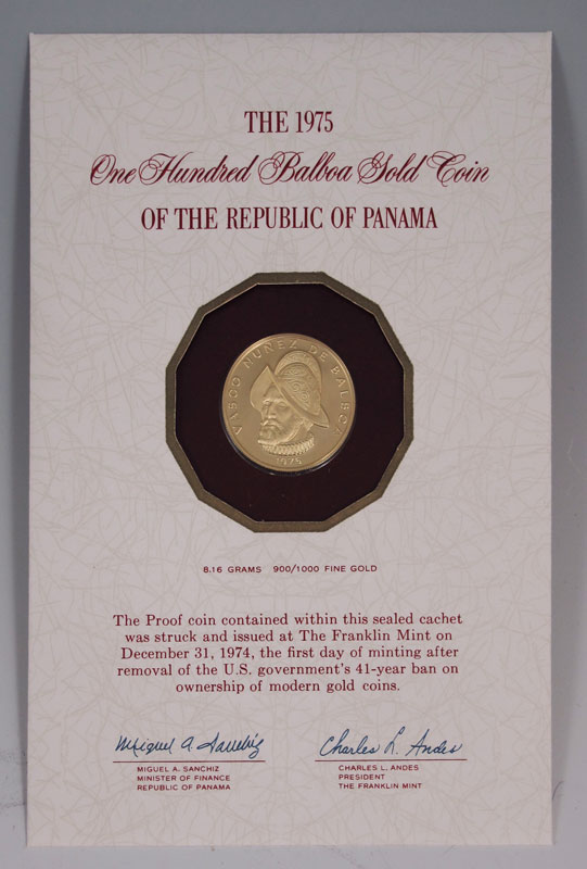 FRANKLIN MINT 1974 ONE HUNDRED BALBOA GOLD COIN: Struck on December 31, 1974 for the Franklin Mint. Comes with original case, paperwork and mailing box. 8.16 grams of 900/1000 gold.