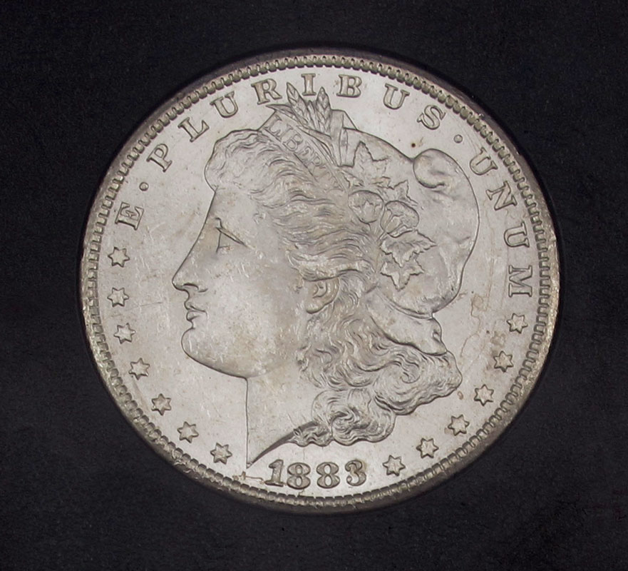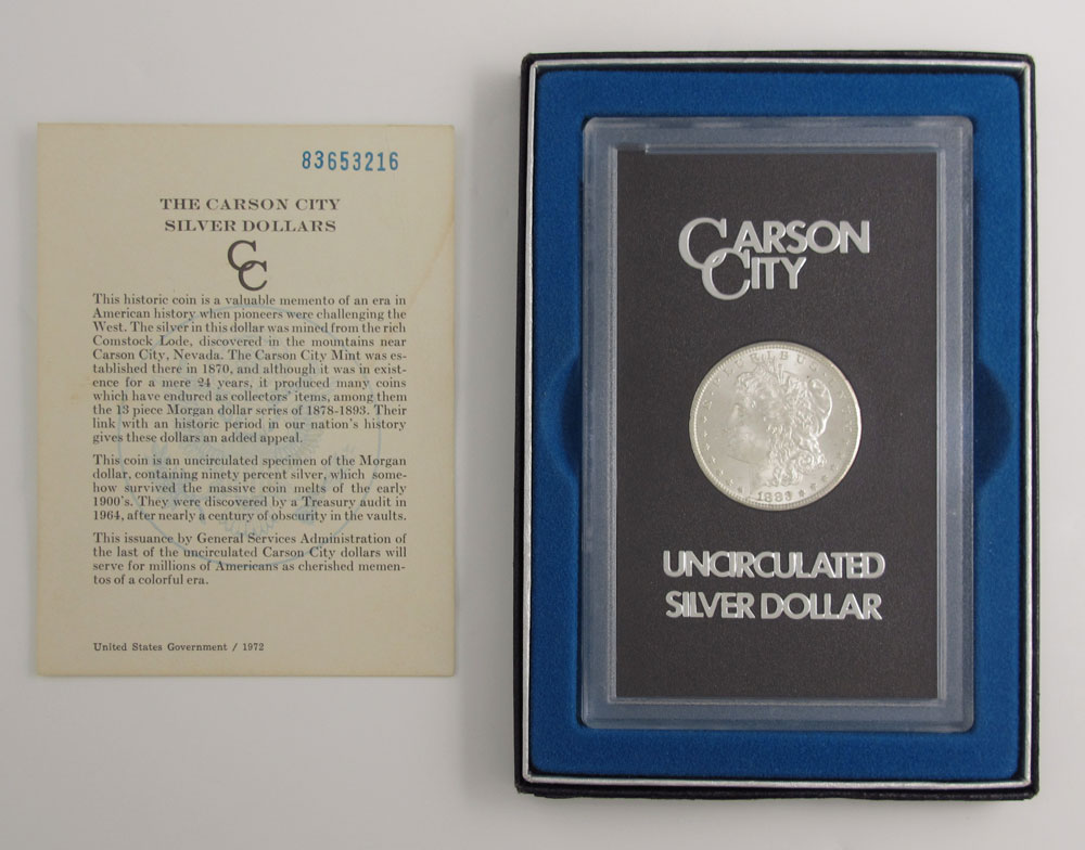 1883 UNCIRCULATED CARSON CITY MORGAN DOLLAR: Released by the General Services Administration, in large protective plastic case with display box. Comes with United States detail sheet.