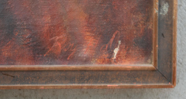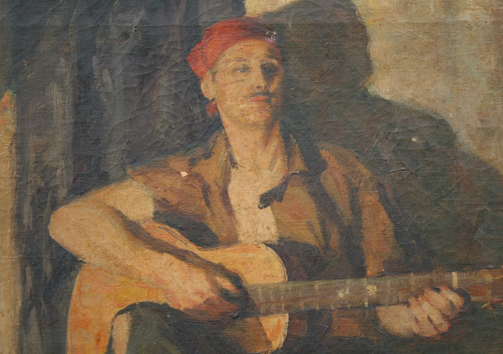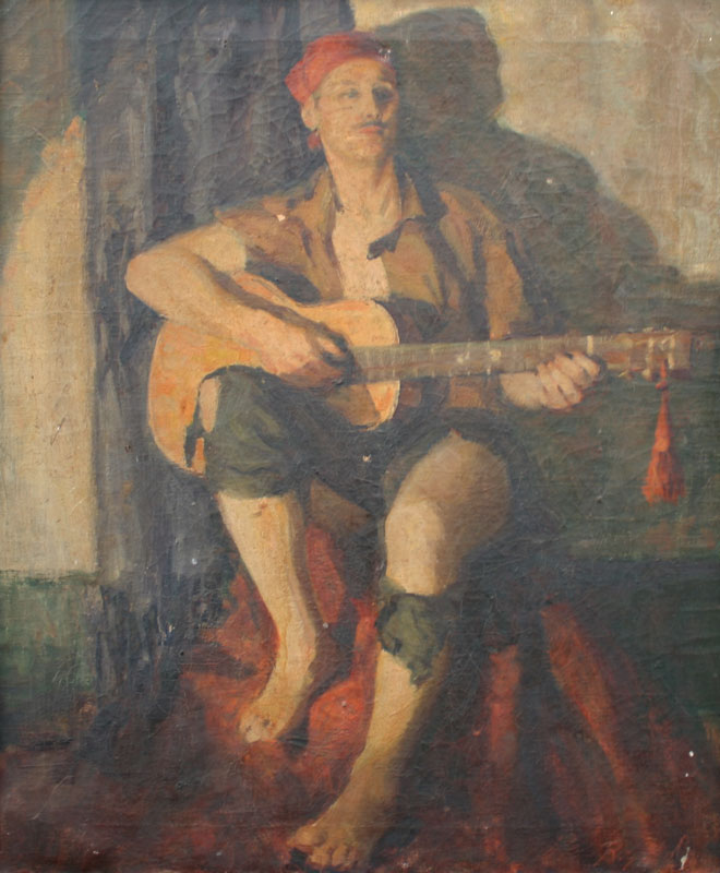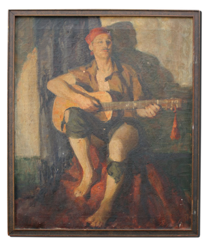 ILLUSTRATION STYLE OIL/CANVAS OF A GYPSY GUITAR PLAYER: signed Roy H. Davis?, 24'' x 20'', worn wooden frame, 25 1/2'' x 21 1/2''.