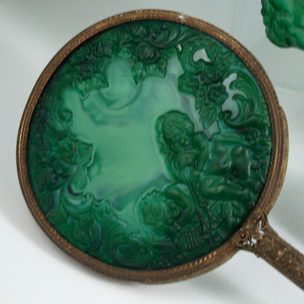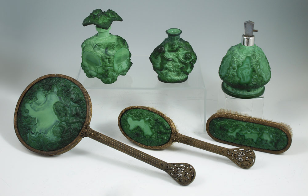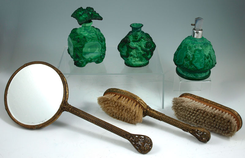 VINTAGE CZECHOSLOVAKIAN MALACHITE GLASS DRESSER SET: 5 piece set to include hand mirror, (10 1/2'') l., hair brush, (10 1/2''), clothing brush, bottle with stopper (5 1/2''), and atomizer perfume (6''). There is also a bottle that is not original to the set, without stopper, 4'' tall.