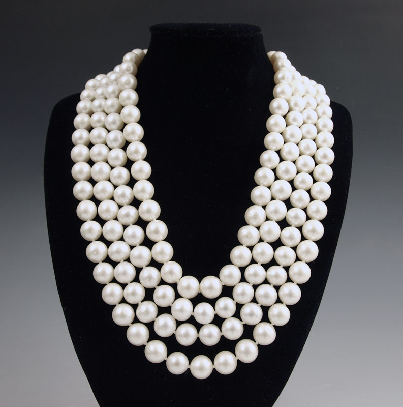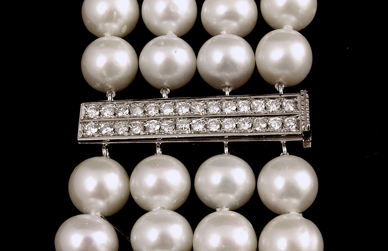 A FOUR STRAND PEARL NECKLACE WITH PLATINUM & DIAMOND CLASP: A four strand necklace of 181 white pearls with slight rose'. The pearls average 9.5 - 10 mm., have a medium high luster, and are well matched. The 1.5'' platinum clasp contains 28 round brilliant cut diamonds, approx. 1 Ctw., average VS in clarity and G-H in color. Necklace is 22''l. Sold with current Florida Diamond Appraisers GIA graduates appraisal for $8,250.