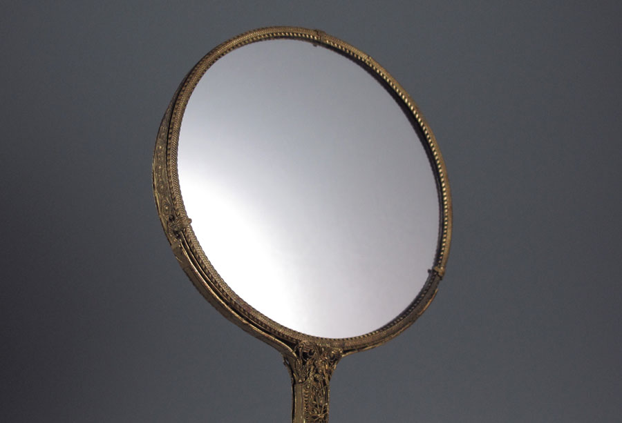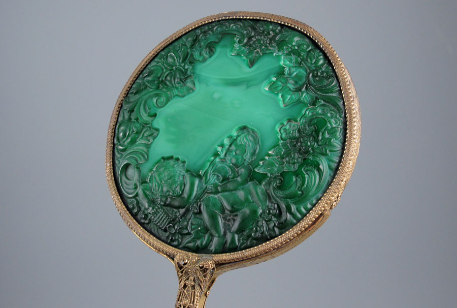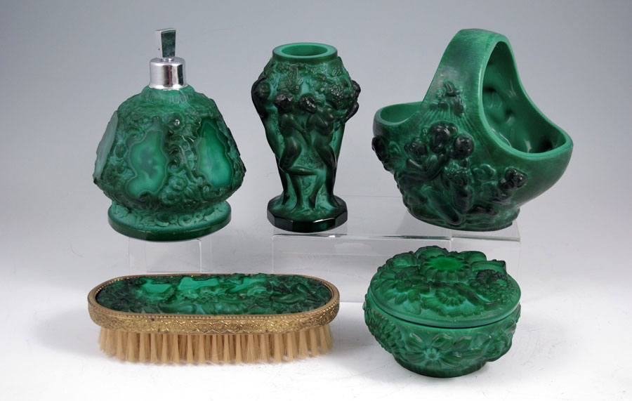 AN ACCUMULATED COLLECTION OF CZECH MALACHITE GLASS: To include the hand mirror (15''), hair brush, clothing brush, a 5'' tall basket, a 4'' dia. covered dresser jar, a 5'' vase with nudes, and a 6'' perfume.
