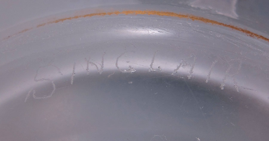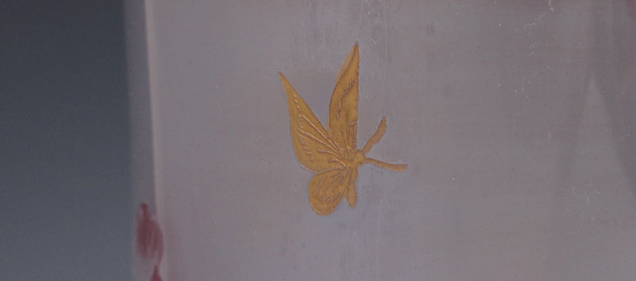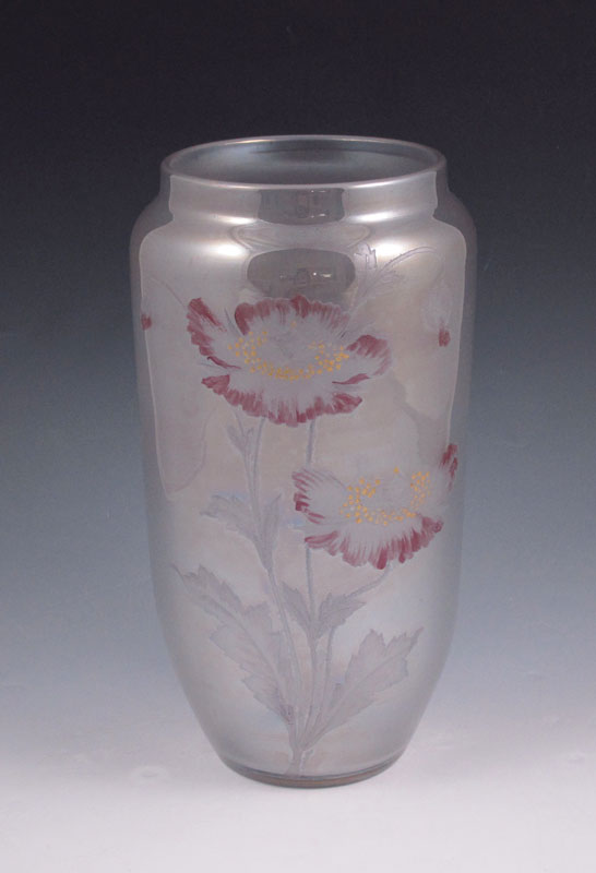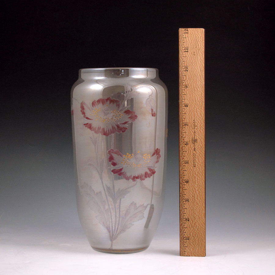 SINCLAIR ETCHED GLASS VASE: High gloss iridescent glass etched in a flower design with colored and gilt embellishment. Signed Sinclair, 10'' tall.