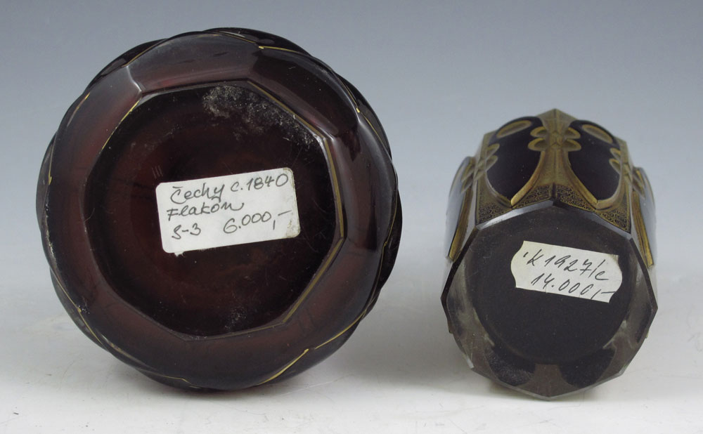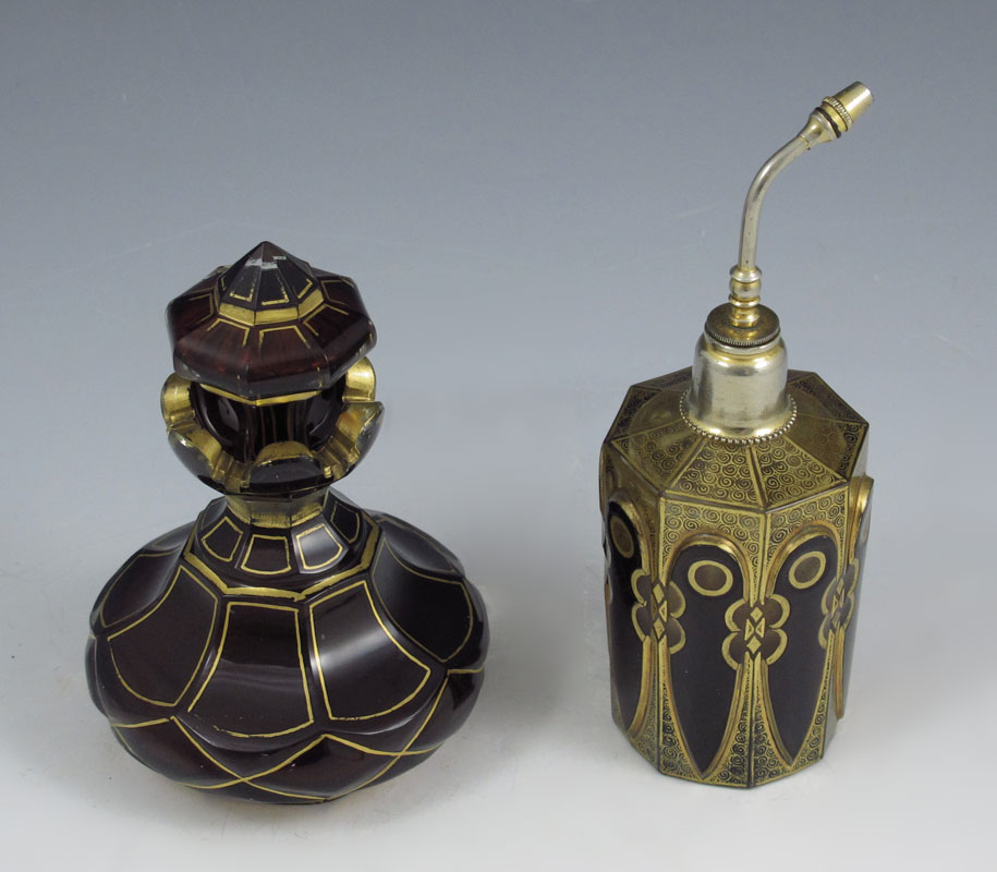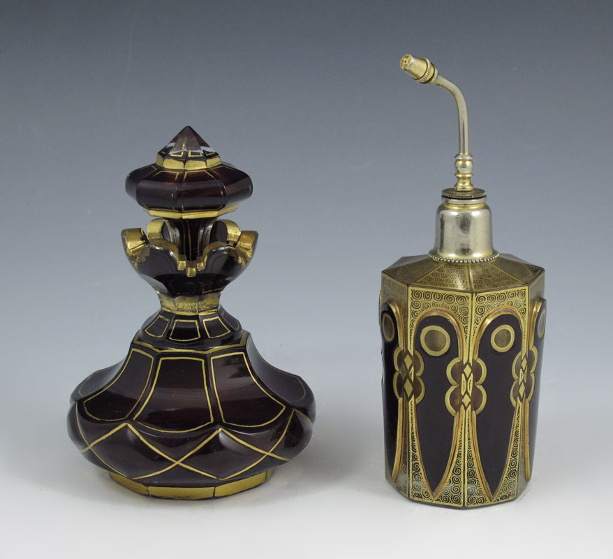 2 EARLY CZECH GILT RUBY GLASS PERFUME BOTTLES: An atomizer and a flacon with stopper. 5 and 5 3/4'' tall overall.