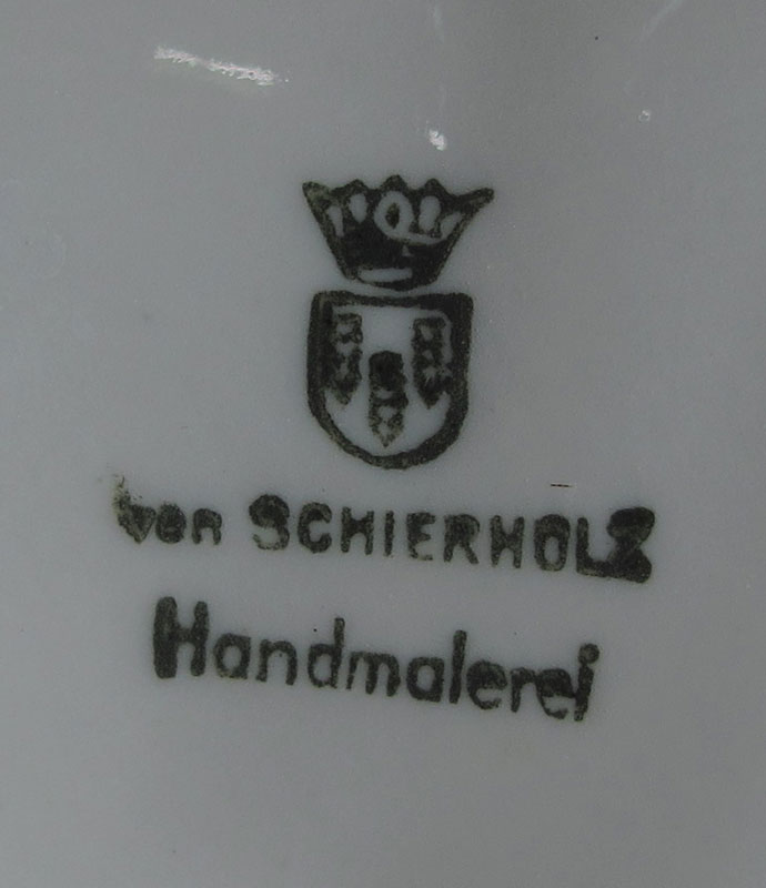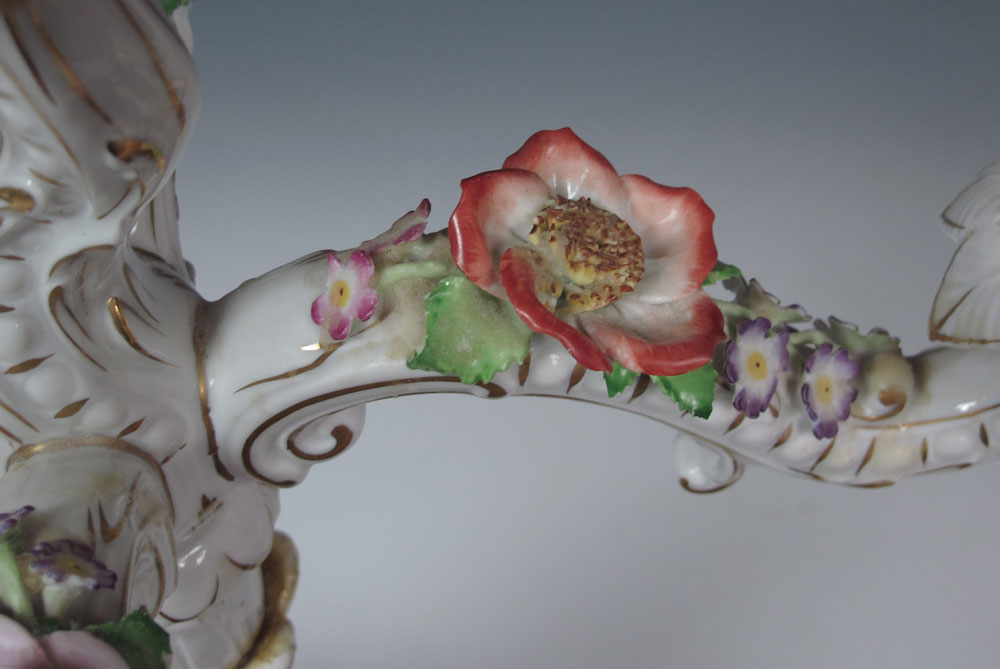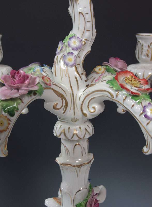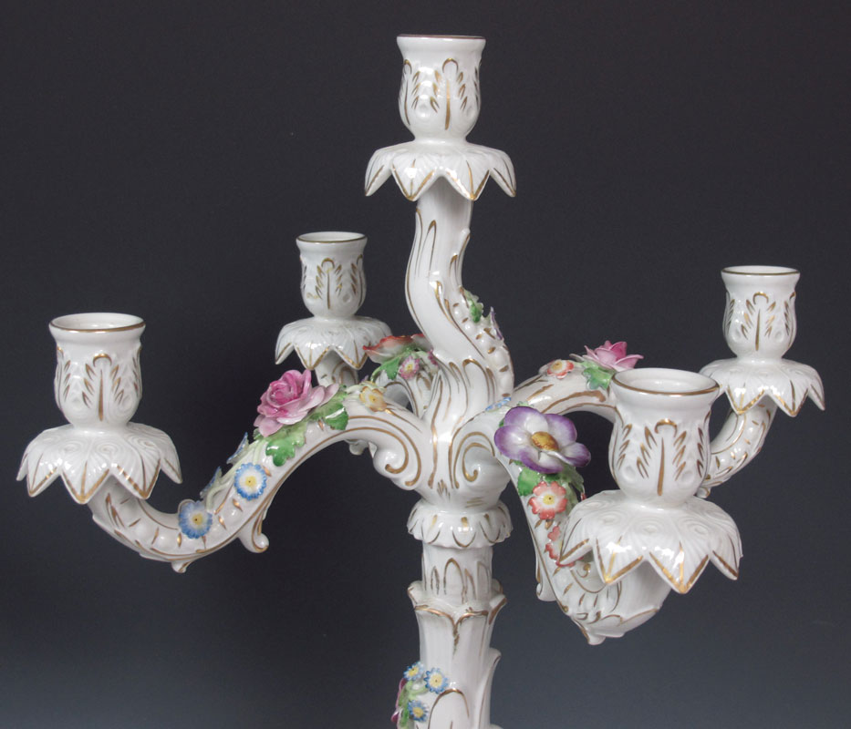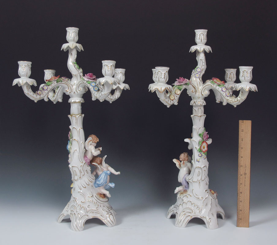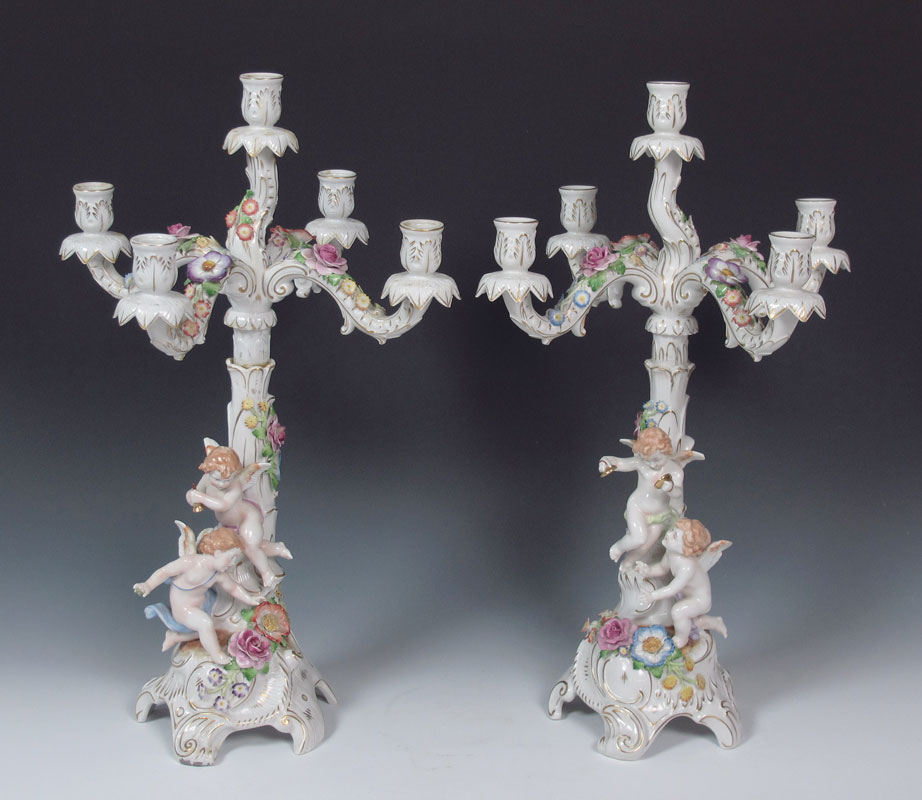 VON SCHIERHOLZ GERMAN PORCELAIN FIGURAL CANDELABRA: Five light candle holders with winged putti and floral decoration. Visible restoration work. Approx. 22''h. x 14''.