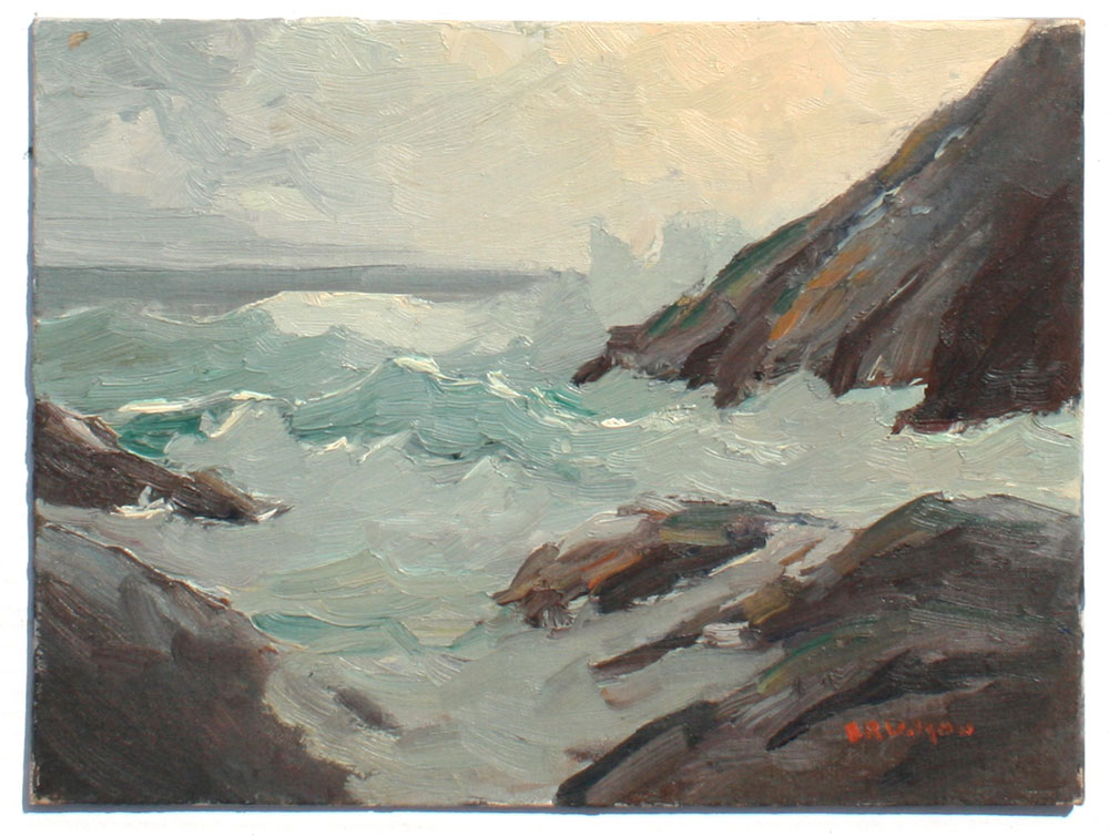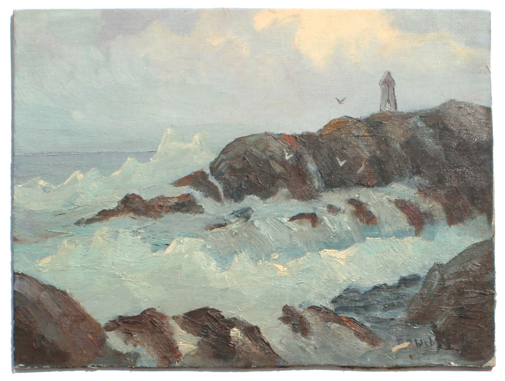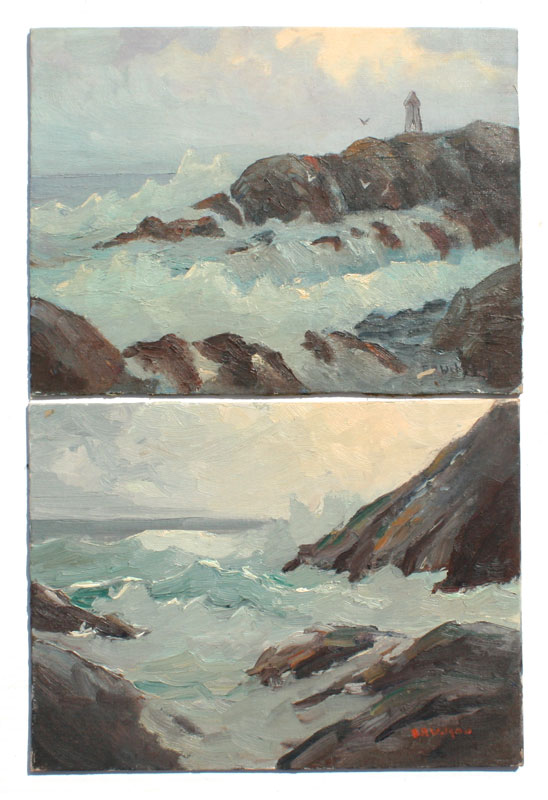 WILSON, Bertram Russell, (Canadian, 20th Century): 2 piece lot; 1) Dark Surf on the Rocks, Oil/Canvas board, 9'' x 12'', signed lower right, unframed; 2) Crashing Surf with Lighthouse, Oil/Canvas board, 9'' x 12'', signed lower right, unframed.