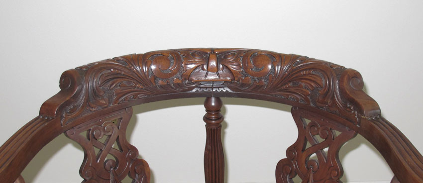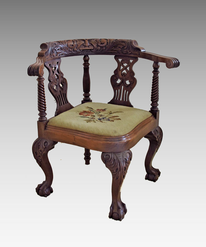 CARVED MAHOGANY CORNER CHAIR: Needlepoint seat, Northwind carved back. 30 3/4'' x 29 1/2'' x 28''.