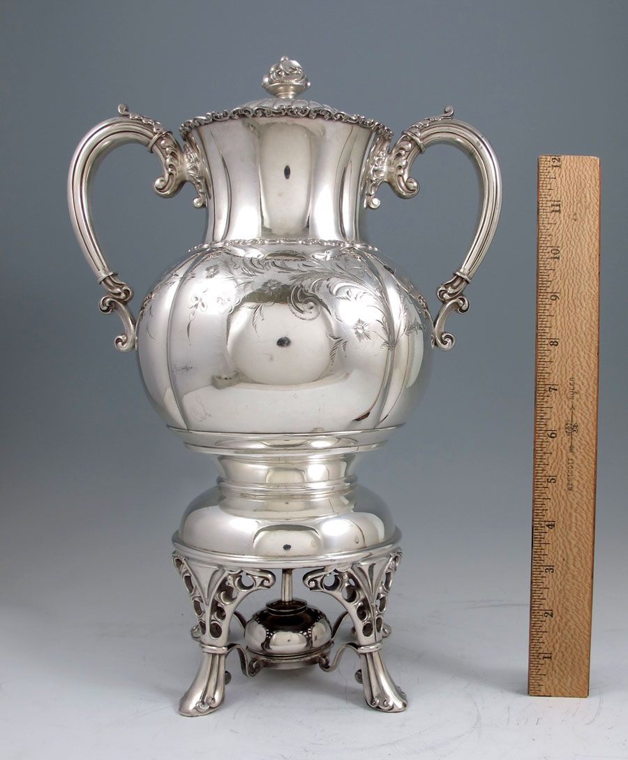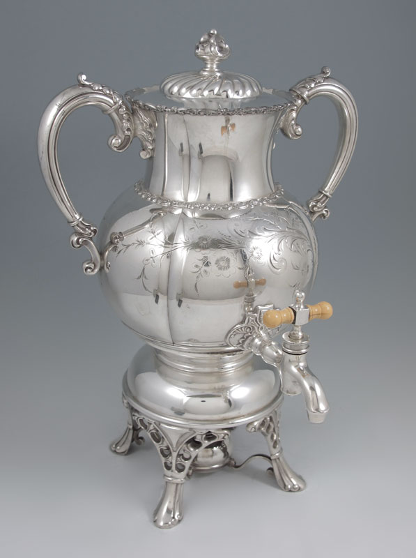 VICTORIAN SILVERPLATE COFFEE URN WITH BURNER: Engraved floral motif, ivory appearance celluloid spout handle. Unmarked as to maker. 14 3/4'' h. x 10'' x 10''.