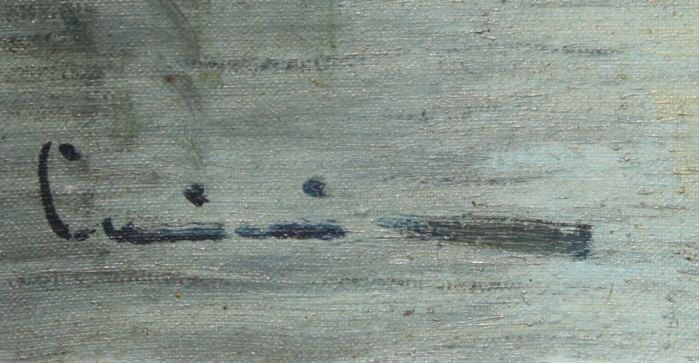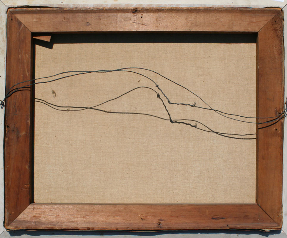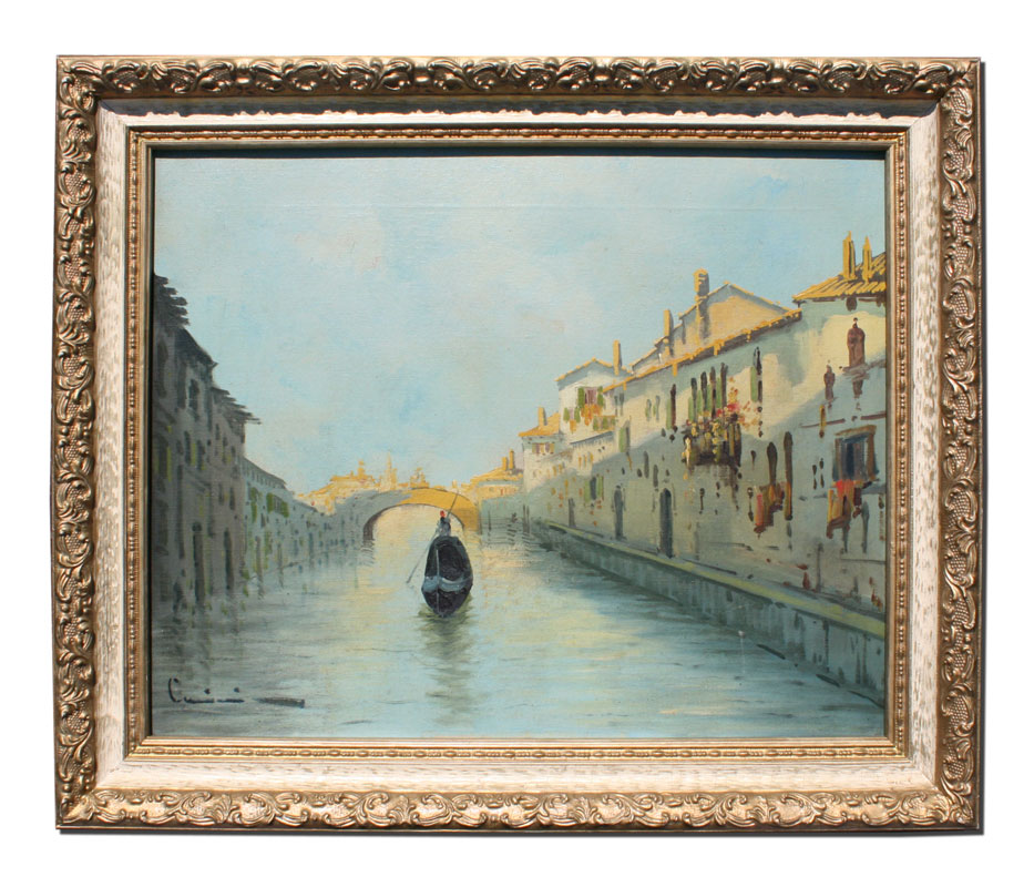 ILLEGIBLY SIGNED VENETIAN CANAL SCENE WITH GONDOLIER: Sight size 16'' x 20'', painted frame, 20'' x 24''.