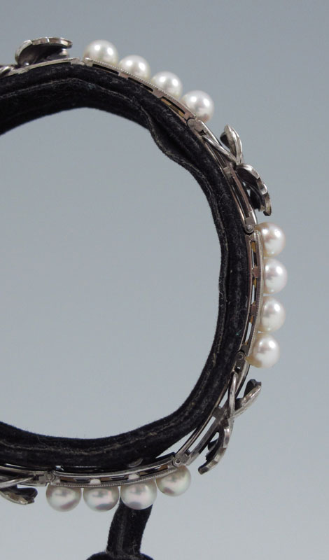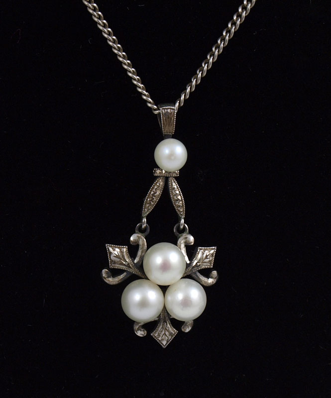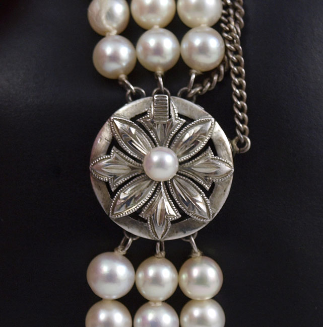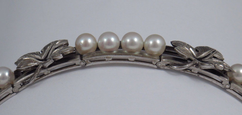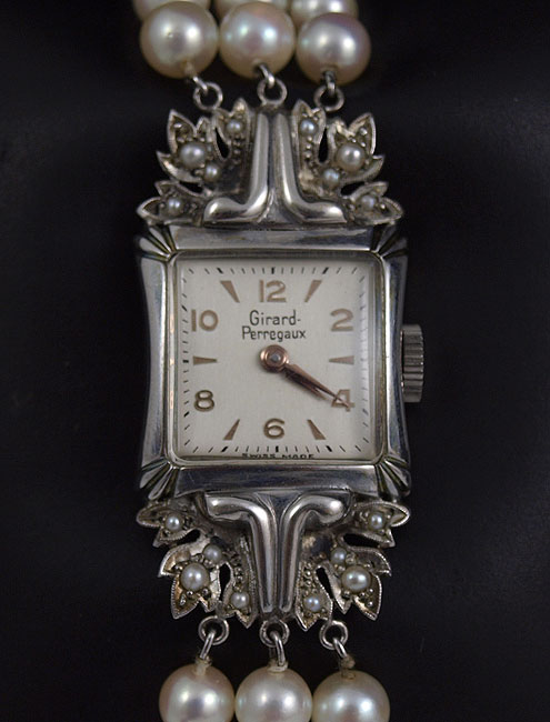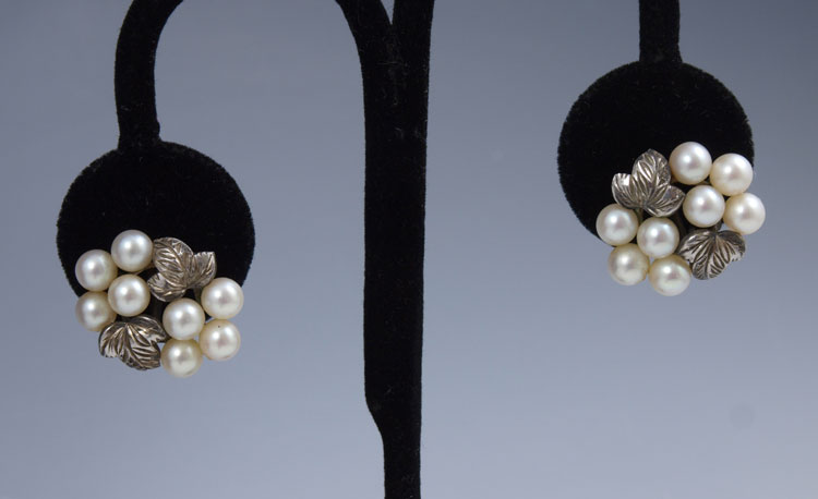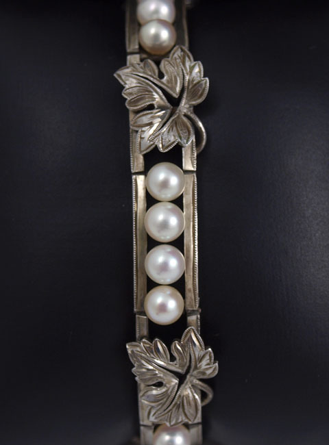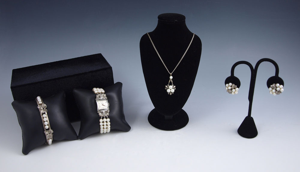 MIKIMOTO PEARL SUITE: 4 piece Mikomoto pearls to include 1) sterling silver bracelet with 5.00 mm pearls and cut-out leaf design. 7'' in length. 2) Sterling silver earrings with 5.00 mm pearls and cut-out leaf design. French screw-back closures. 3) Sterling silver wristwatch with 5.00 mm pearl bracelet and cut-out leaf design. Girard-Perregaux movement. The watch is not running. 4) Sterling silver necklace with 4.00-5.00 mm pearls pendant, 16'' chain. Weight: 30. grams Approx.