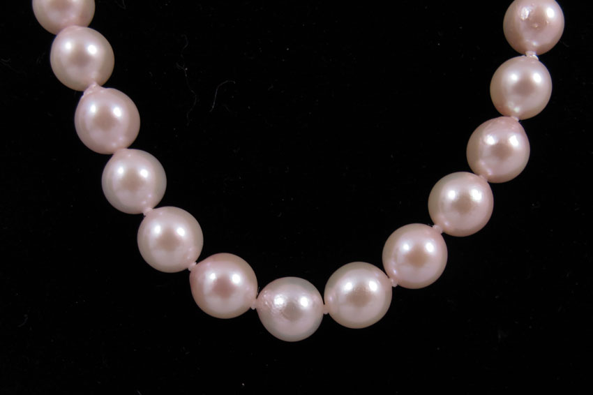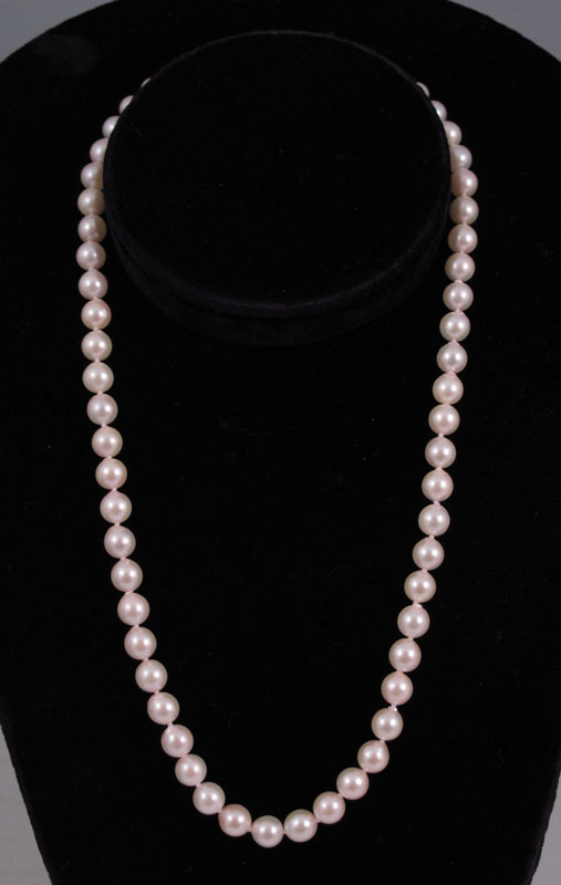 18'' JAPANESE AKOYA PEARLS: 18'' Strand of 6.50-7.00 mm cultured pearls. Semi-round and slight baroque shape. Very blemished. Light cream color. Medium luster. 14K filigree clasp.