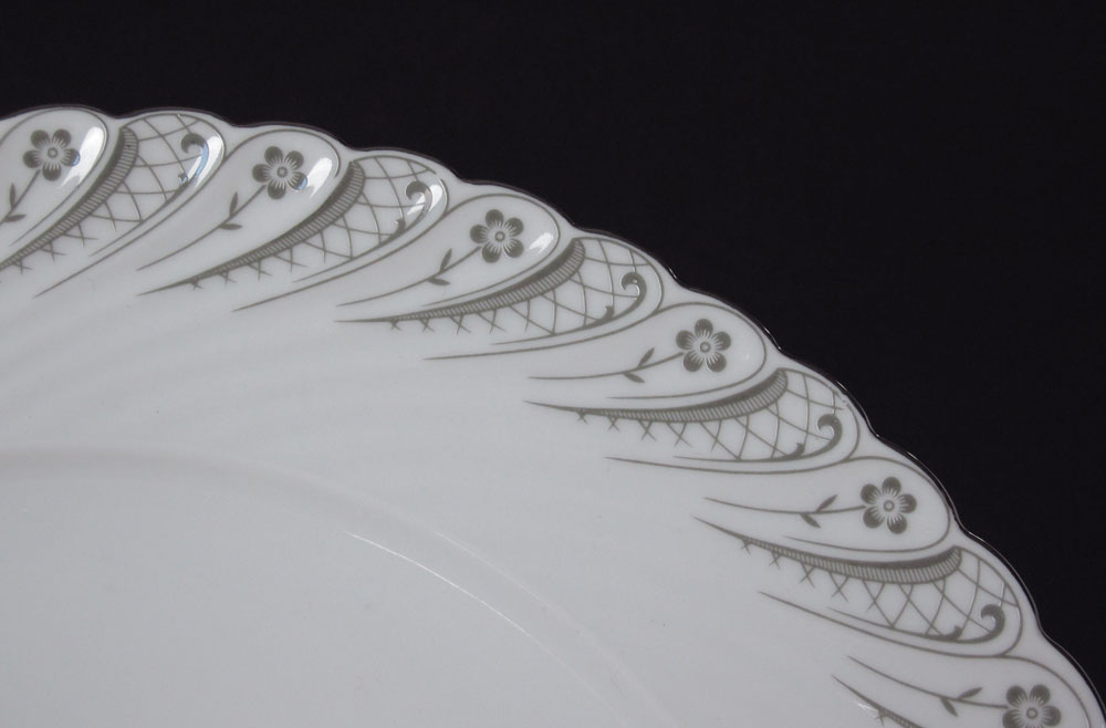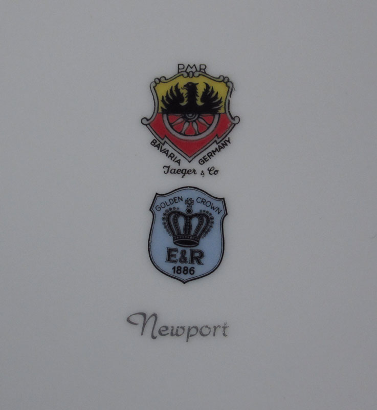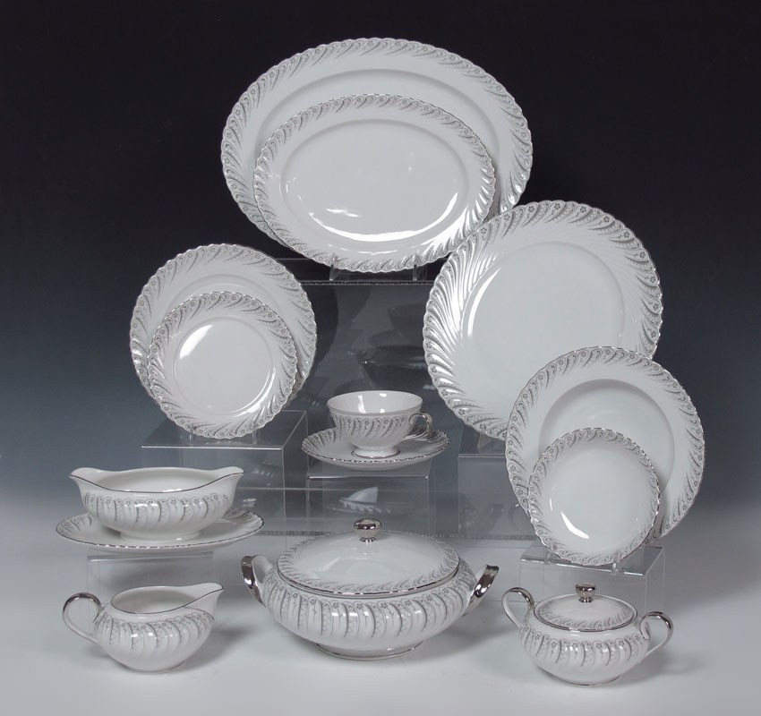 JAEGER & CO PLATINUM RIM CHINA IN THE NEWPORT PATTERN: Ca. 1961-1969. Approx. 95 pieces to include 13 dinner plates, 14 salad plates, 11 soup bowls, 12 bread plates, 12 dessert bowls, 12 cups and 12 saucers, 3 oval vegetable, 1 covered vegetable, creamer, sugar, gravy, and 2 platters.