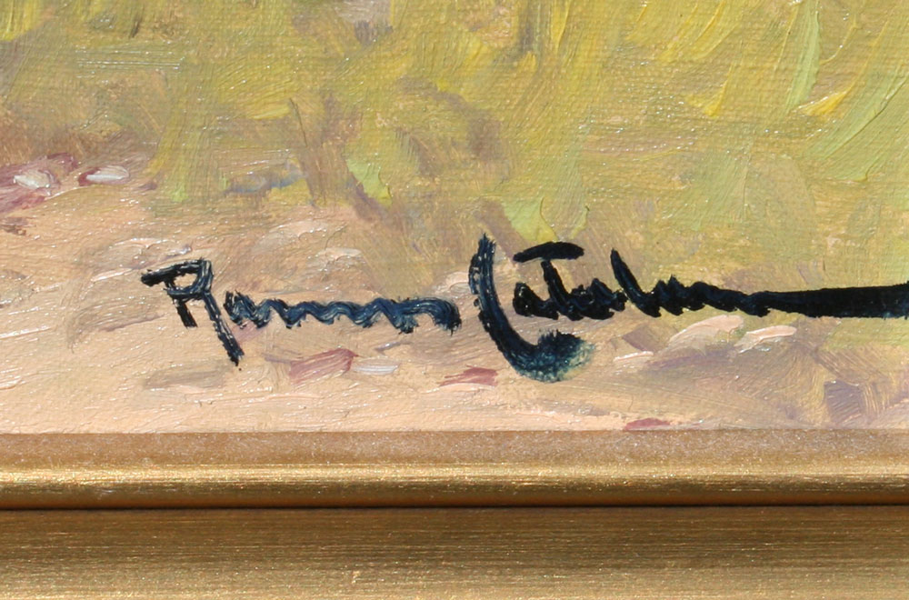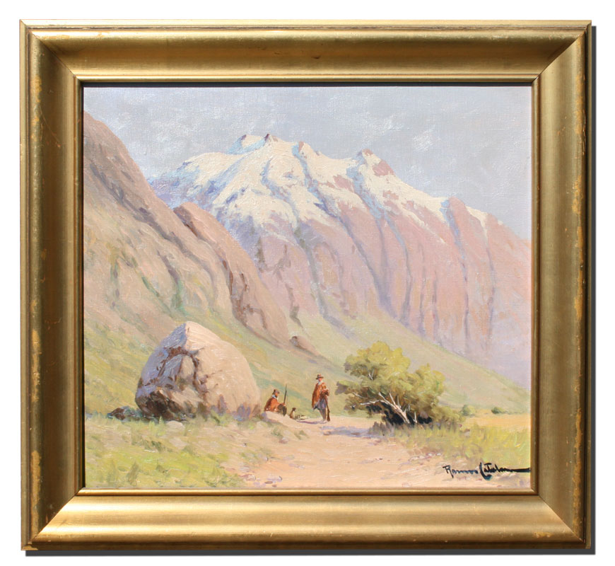 CATALAN, Benito Ramos, (Chilean, 1888-1961): Travelers at rest with snow capped mountain in the distance, Oil/Canvas, 15 3/4'' x 17 3/4'', signed, gilded frame, 20'' x 22''.