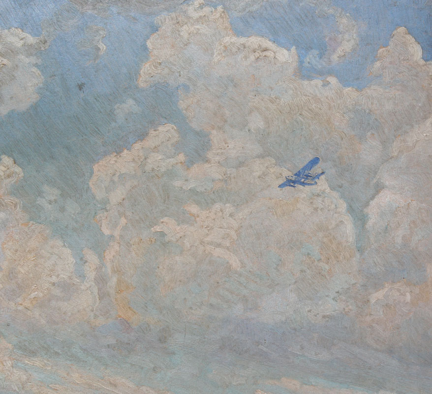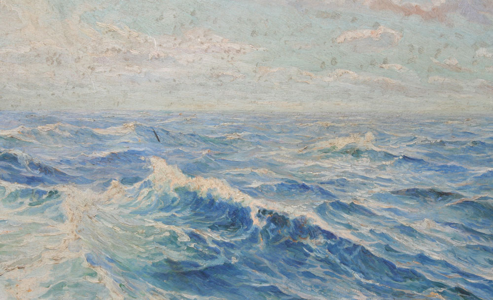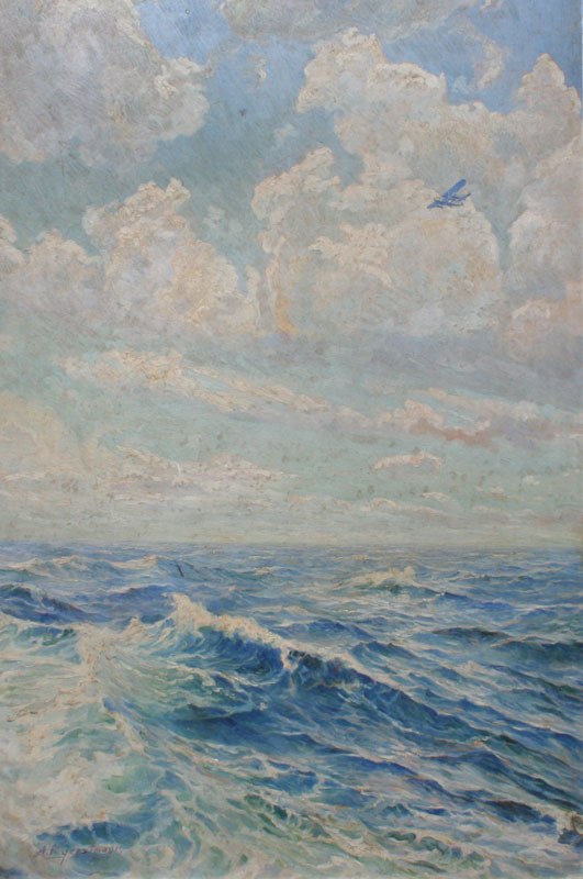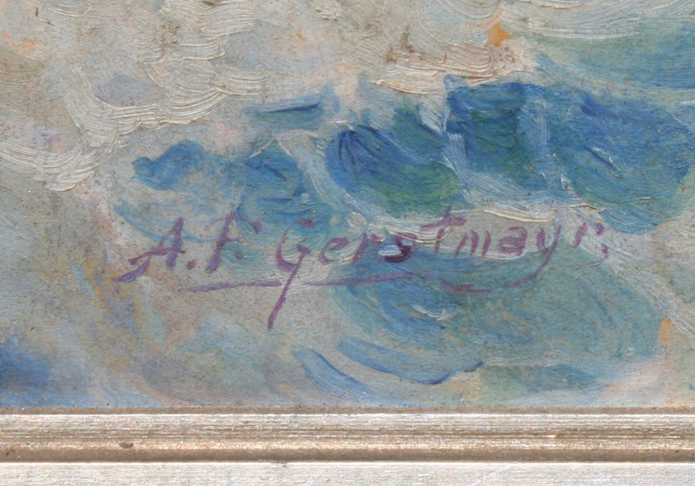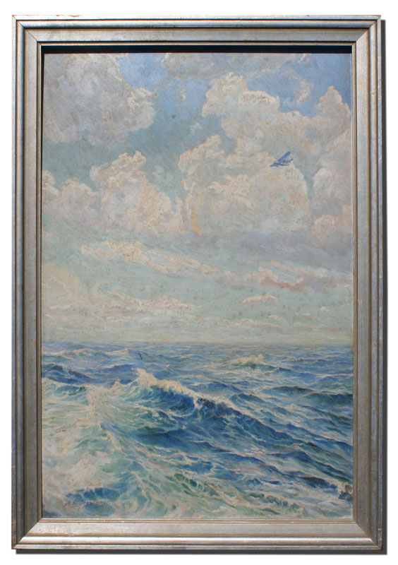GERSTMAYER, A.F., (American, 20th C): Ocean White Caps with Sea Plane Flying Above, Oil/Board, 25 1/2'' x 17 1/4'', signed, silver gilded frame with wear, 28'' x 19 3/4''.