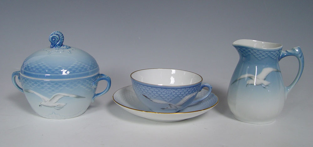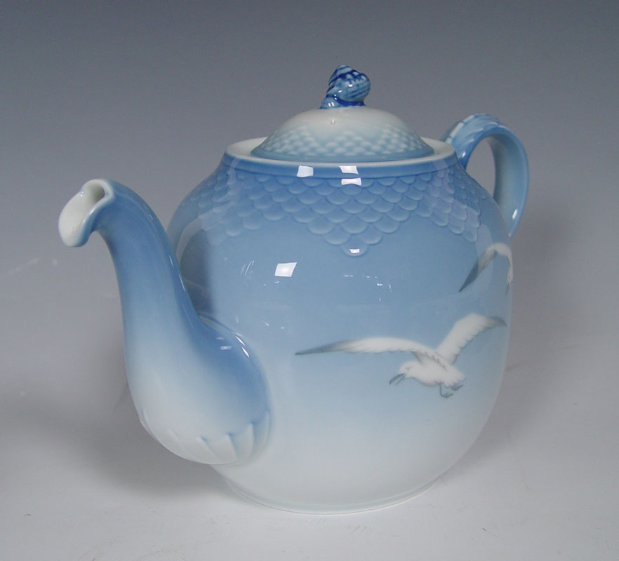 BING & GRONDAHL SEAGULL TEA SERVICE: The set include teapot with shell finial, creamer, covered sugar with seahorse finial, and 6 cups with saucers. Teapot is 6'' tall.