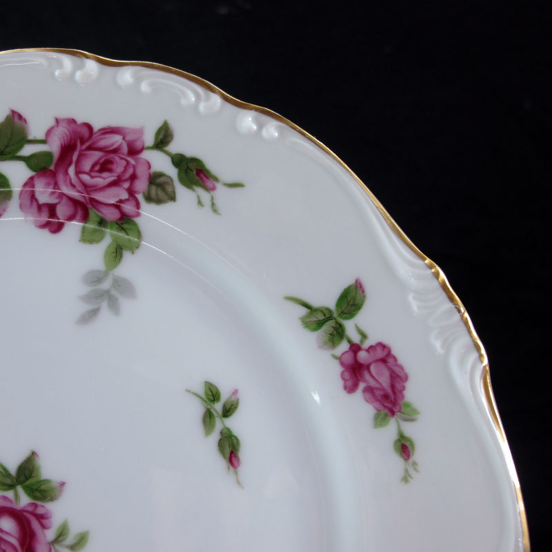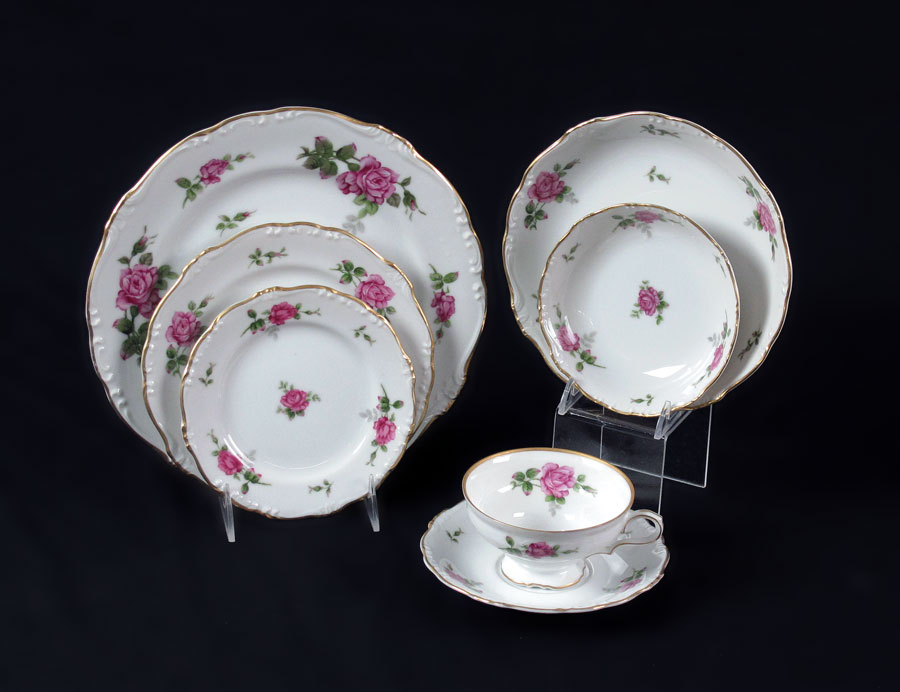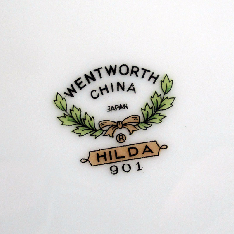 WENTWORTH FINE CHINA IN THE ROSE DECORATED ''HILDA'' PATTERN: Complete for 10 plus extras, approx. 93 pieces to include 10 dinner plates, 11 salad plates, 12 soup bowls, 13 bread plates, 12 dessert bowls, 10 saucers, and 16 cups. Serving are the salt and pepper, cream, sugar, 2 open vegetable bowls, relish dish, gravy, 12: platter and the 16'' platter.