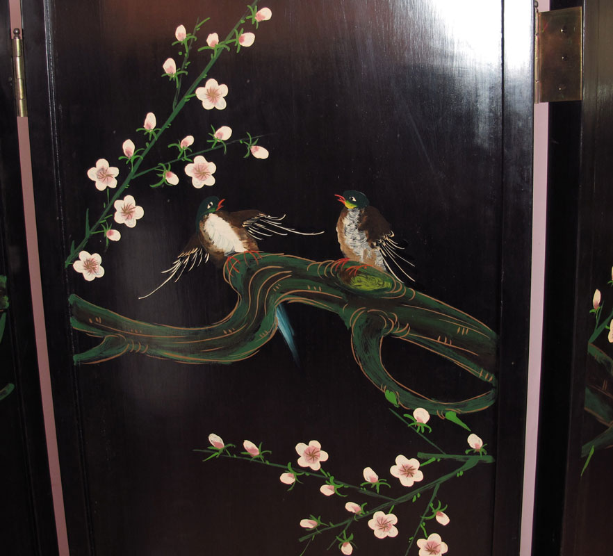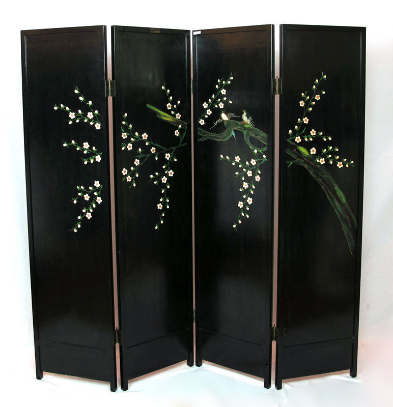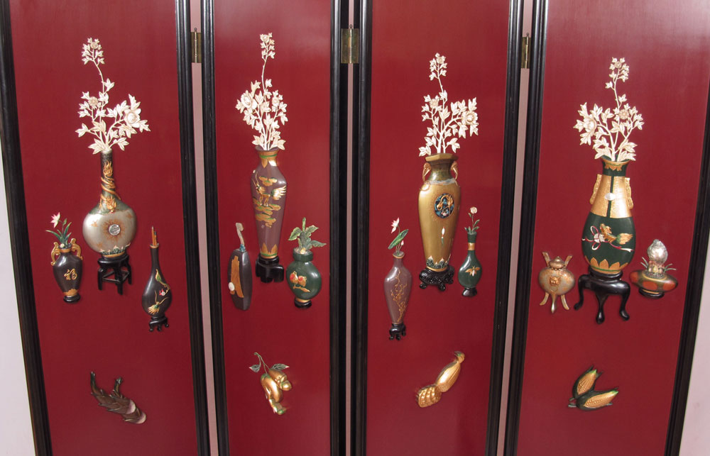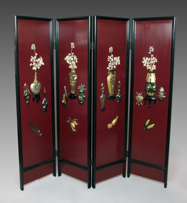 GEORGE ZEE 4 PANEL ORIENTAL FLOOR SCREEN: Painted bird and floral decoration one side, applied carved vases verso. Original George Zee metal tag. Each panel 71'' x 18''.