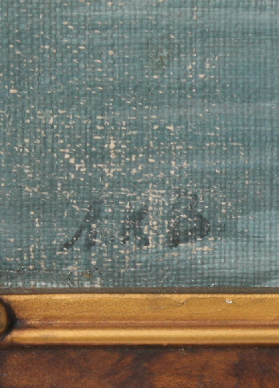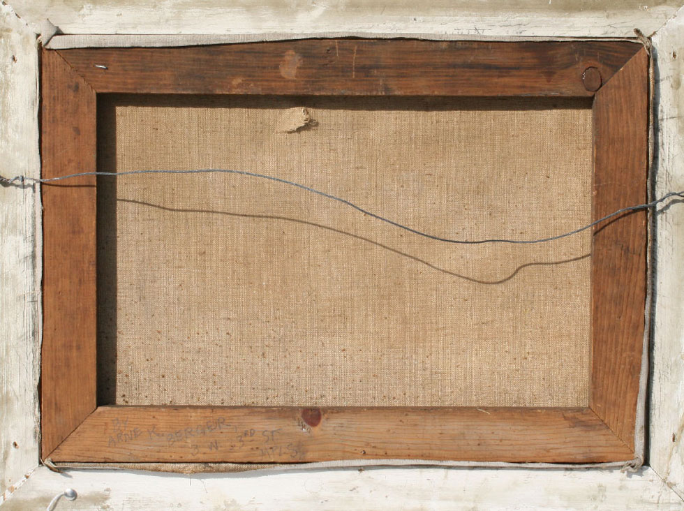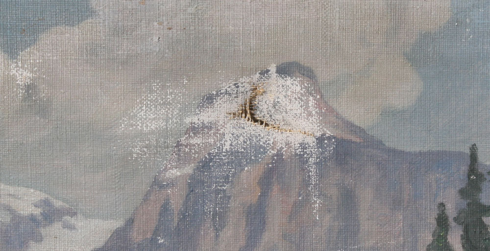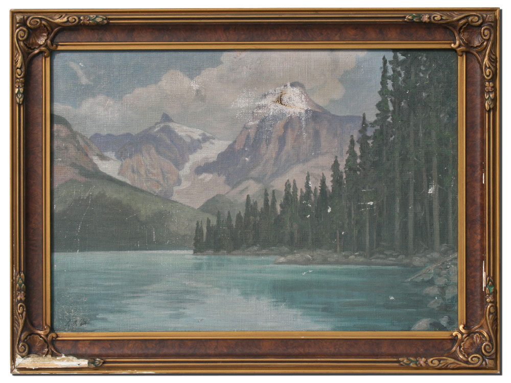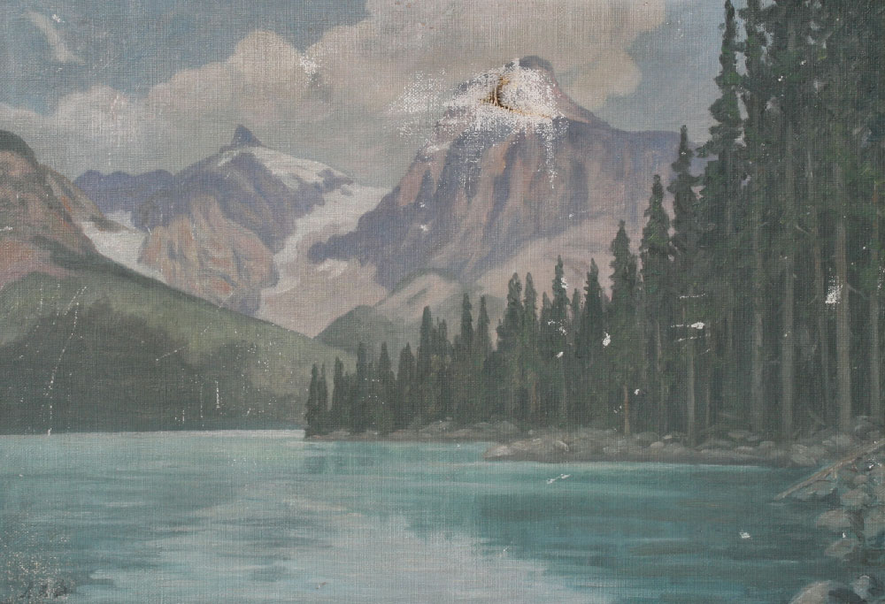 BERGER, Arne K., (American/Norwegian, 1872-1934): Lakeside Landscape with Snow Capped Mountains in the Distance, (possibly Lake Louise), Oil/Canvas, 14'' x 20'', monogrammed, signed on stretcher verso, frame with damage, 17 1/2'' x 23 1/2''.