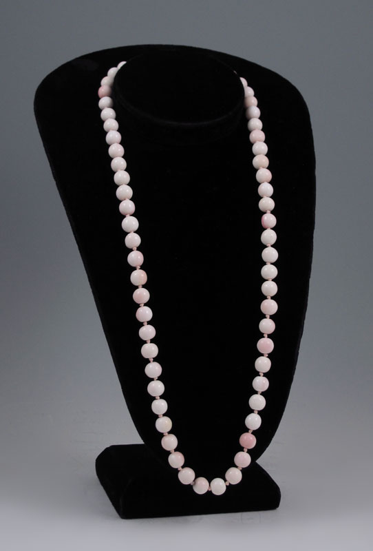 CORAL STRAND BEAD NECKLACE: Angel skin and light pink coral beads, approx. 9 mm. beads, 24 1/2''l.