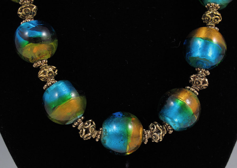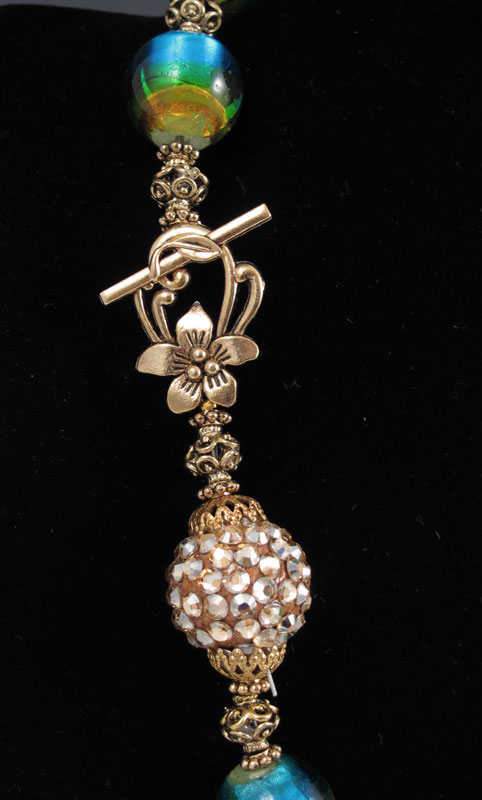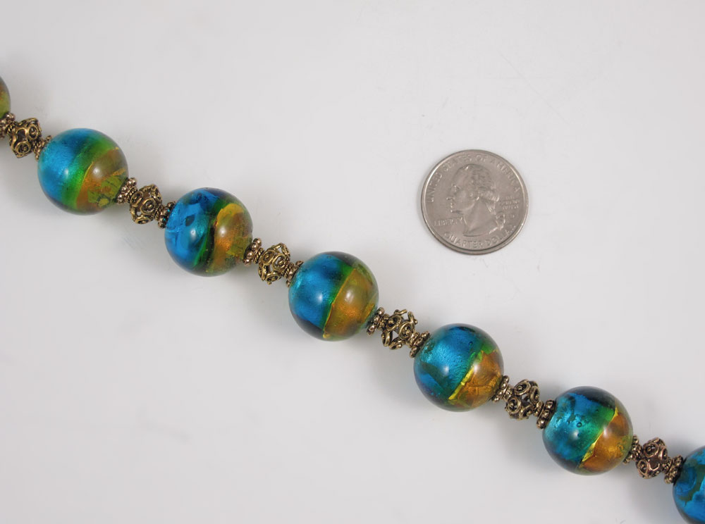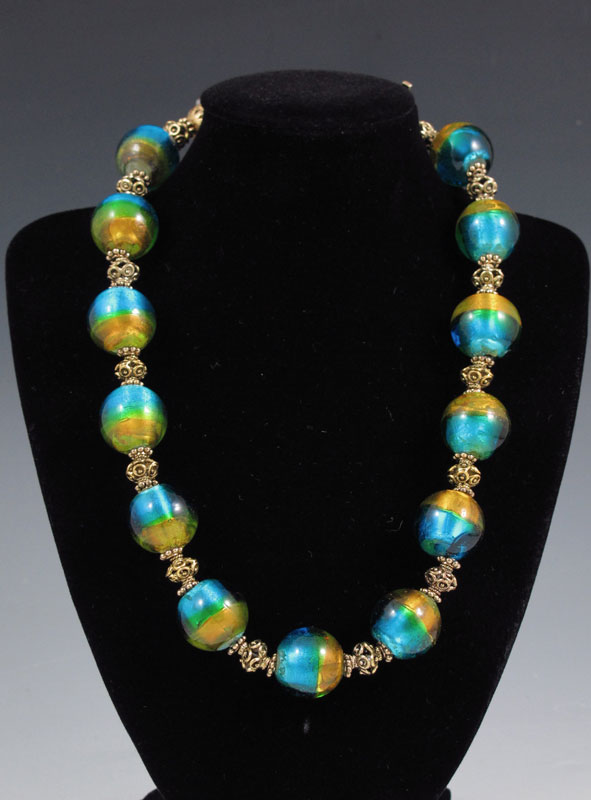 VENETIAN GLASS BEAD NECKLACE: With a Swarovski crystal encrusted bead. The Venetian beads measure approx. 19.5 mm. Necklace is 17 1/2''l.