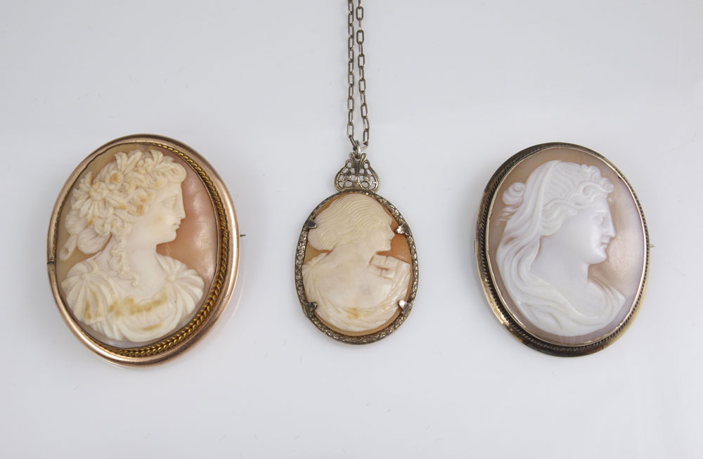 3 CAMEOS: 1) Gold filled frame with 50.00 x 35.00 mm Grecian bust cameo. 2) Gold filled frame with 50.00 x 35.00 mm Victorian bust cameo. 3) Sterling necklace with 30.00 x 20.00mm Edwardian bust cameo.