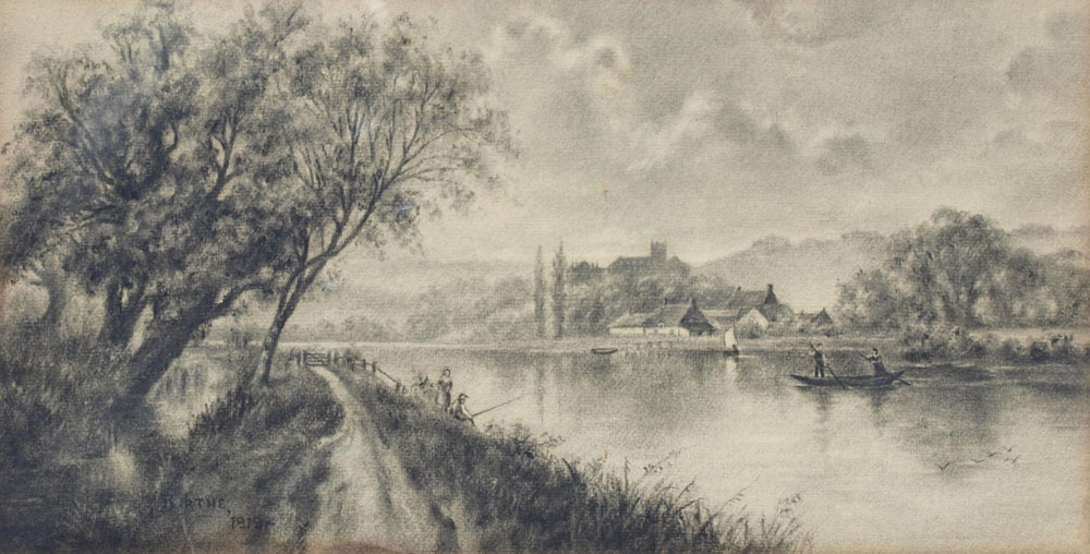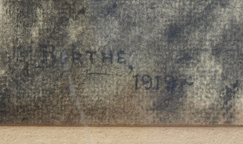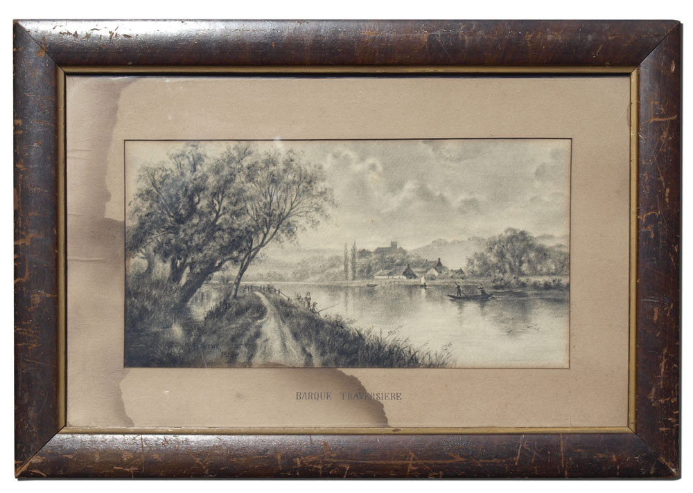 'BARQUE TRAVERSIERE'' CHARCOAL DRAWING SIGNED BERTHE, 1919: Sight size 8 5/8'' x 17 1/4'', period frame with wear, 17'' x 26''.