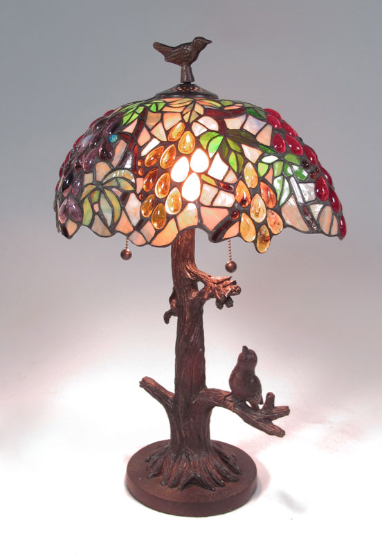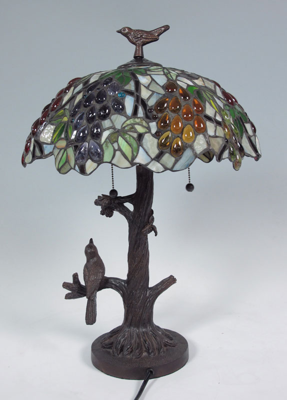 MODERN BIRD DESIGN LEADED GLASS LAMP: Internet bidding is not available on this item. Resin figural bird on the base. 24'' h. x 6 1/2'' dia. Shade 7 1/2'' h. x 16 1/2''.