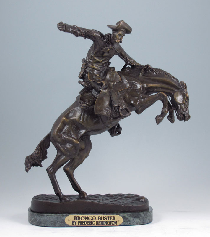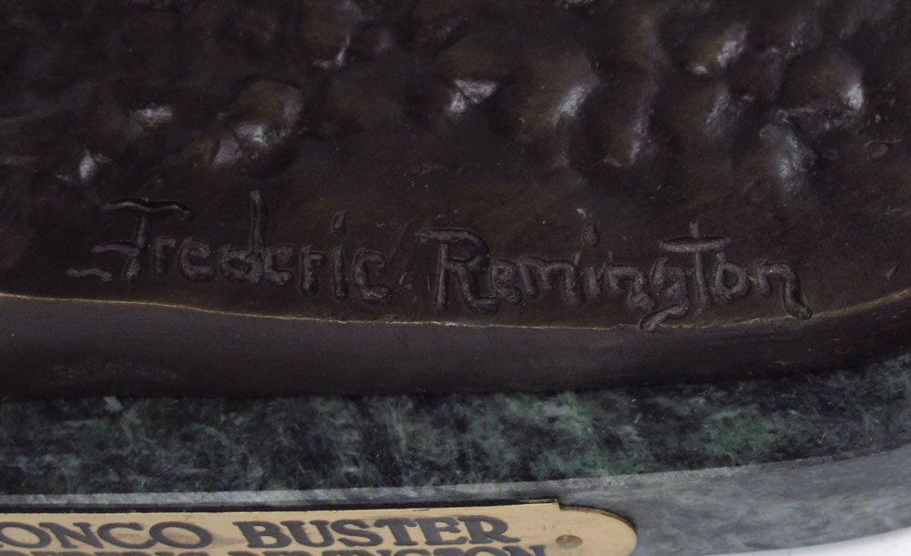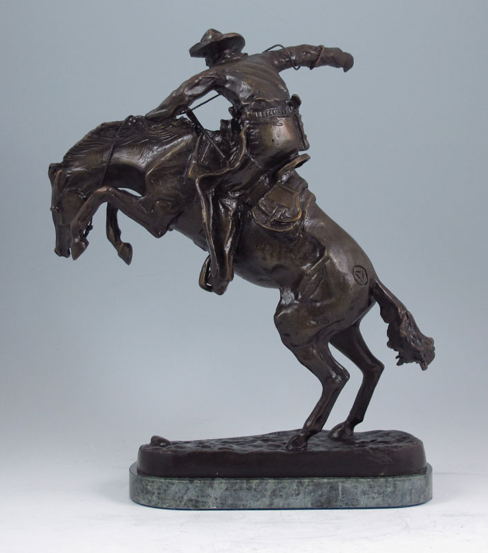 REMINGTON, Frederic, (American, 1861-1909): After Remington, Bronco Buster, bronze on green marble base. 12 1/2'' x 10 3/4'' x 4 1/2''.