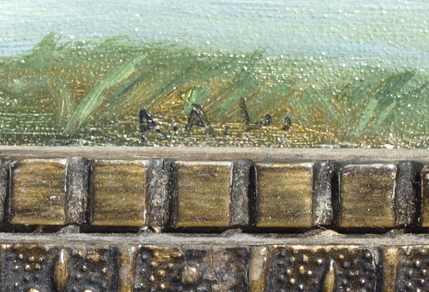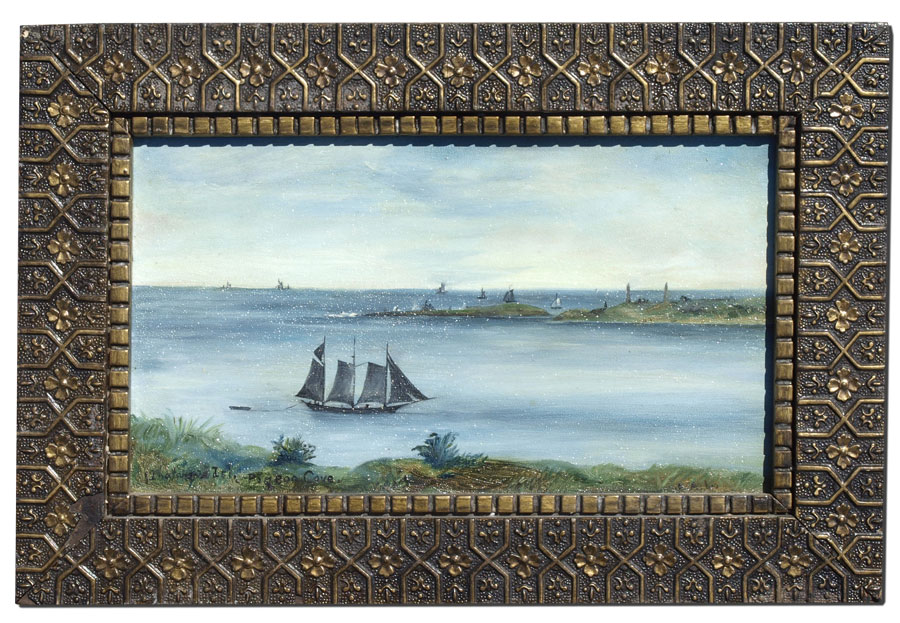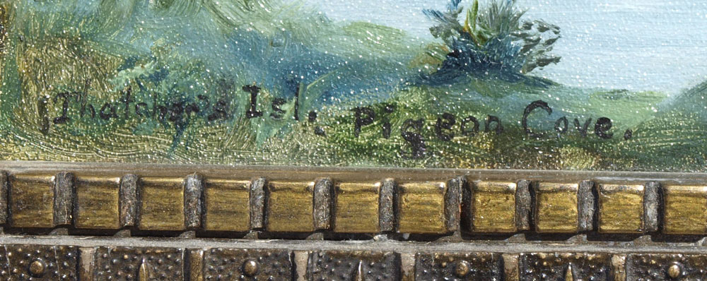 PRIMITIVE FOLK ART OIL/BOARD OF THATCHER ISLAND, PIGEON COVE MONOGRAMMED P.A.L?: Sight size, 6'' x 10 3/4'', gilded gesso frame with wear, 9 3/4'' x 14 1/2''.