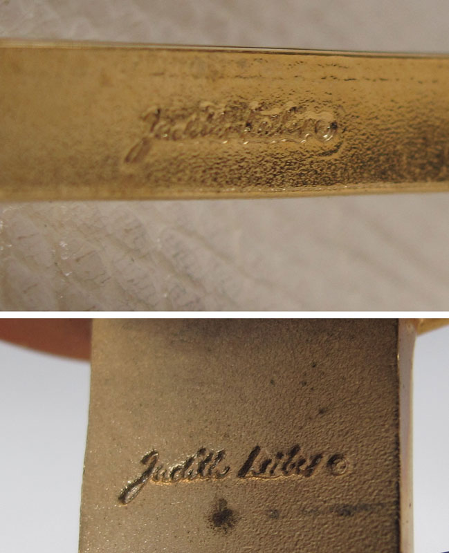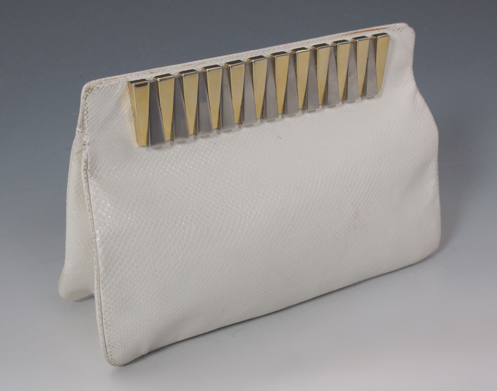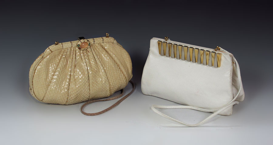 TWO JUDITH LEIBER REPTILE LEATHER PURSES: 1) White with two tone mystery clasp, leather strap, 6''h. x 10''. 2) Bone color, cabochon clasp. Both with leather straps.