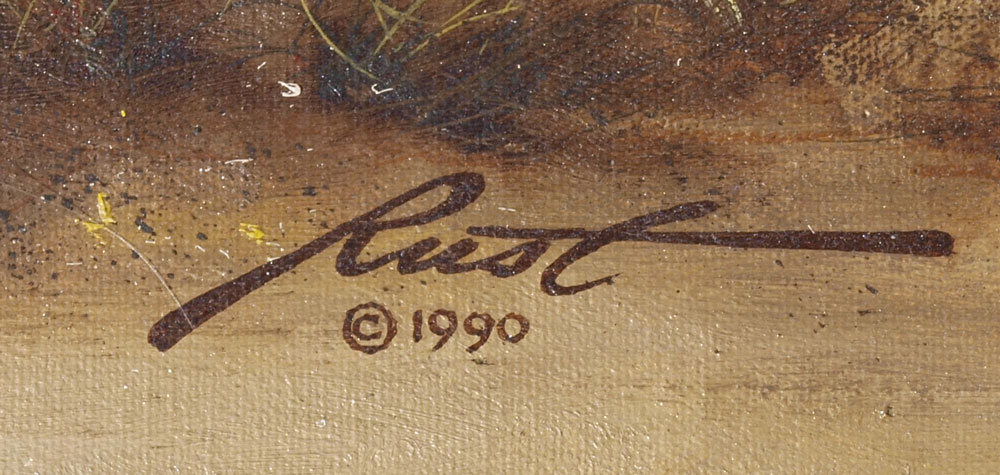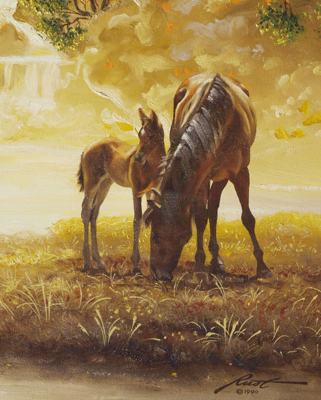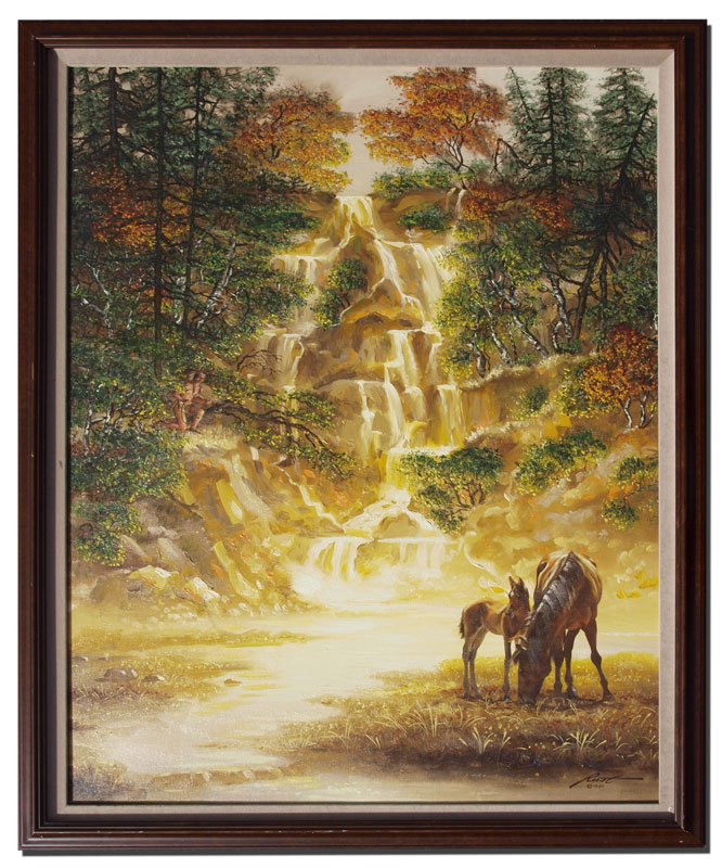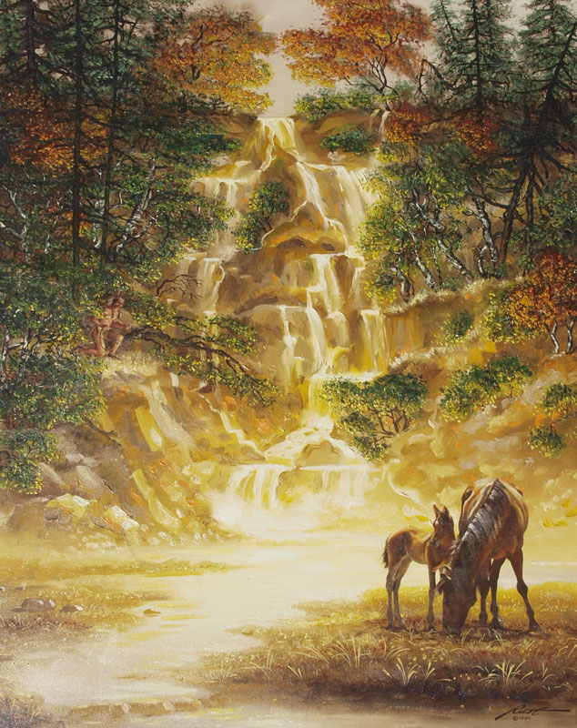 RUST, Donald L., (American, 1932-): Indian Brave Stalking the Ponies with Illusion of a Face in the Waterfall Behind him, Oil/Canvas, 39'' x 29'', signed lower right, framed, 44'' x 33 1/2''.