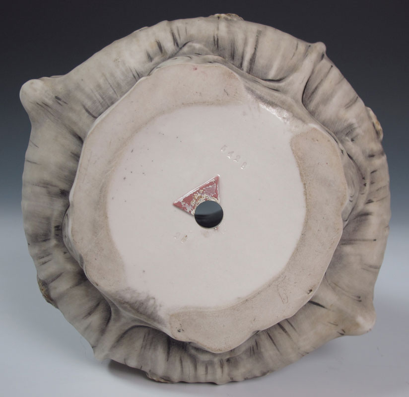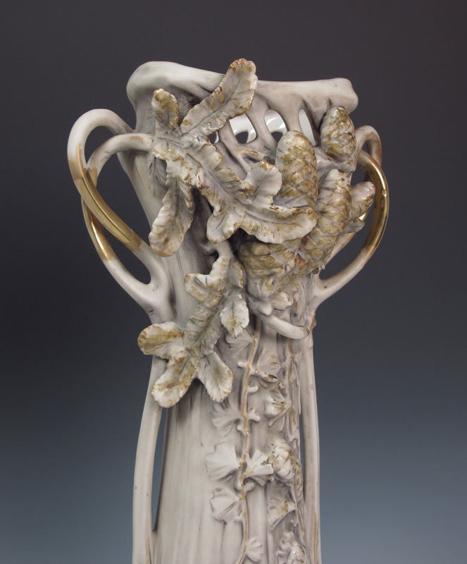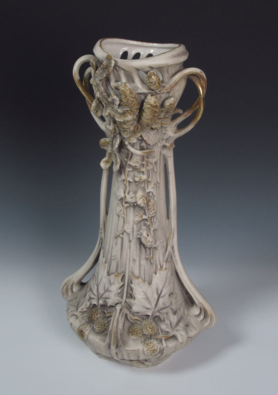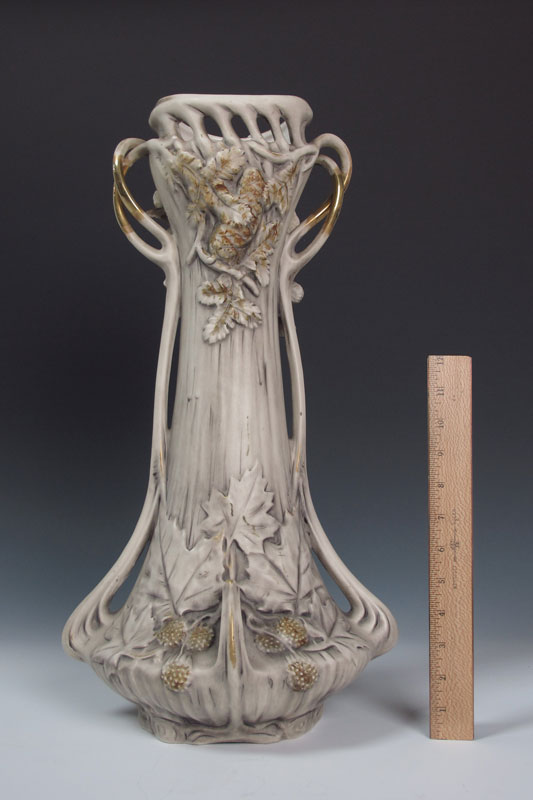 ART NOUVEAU ROYAL DUX VASE: A large double handle with raised seed and leaf design. Pink triangle mark, drilled as for a lamp. 21 3/4'' tall.