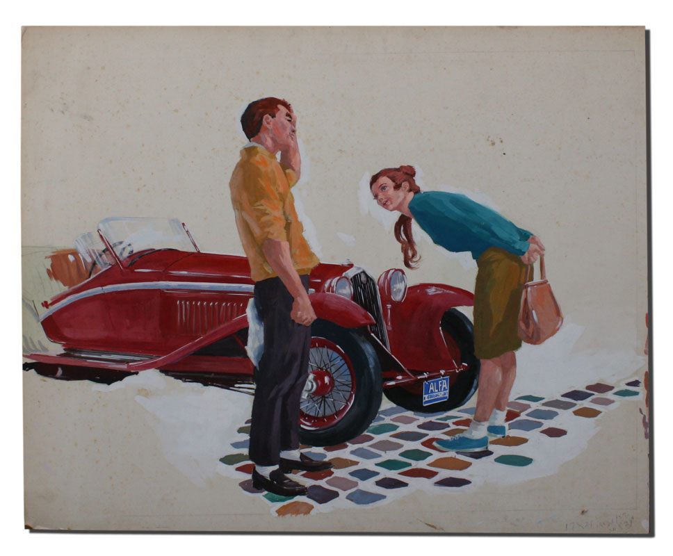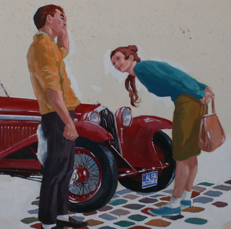 Green, John, (American, 20th C.): Illustration of a Young Couple Inspecting an Alfa Romeo Classic, Gouache, full paper size 20'' x 24'', marked John Green verso, unframed.