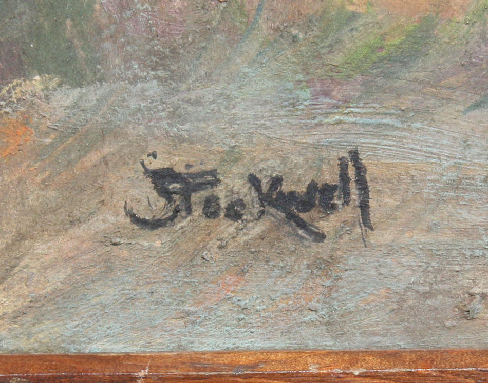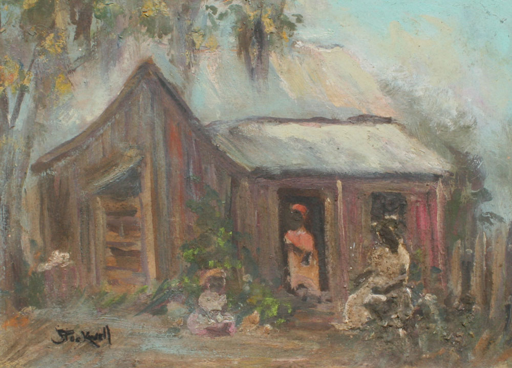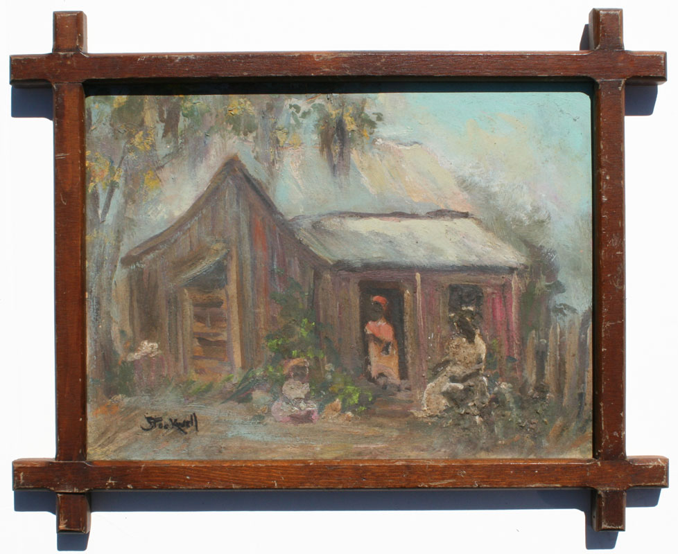STOCKWELL, Catherine, (American, 1895 - 1983): 3 Black figures in a Florida landscape with cabin, Oil/Board, 8 1/2'' x 12'', worn wooden frame, 12'' x 15''.