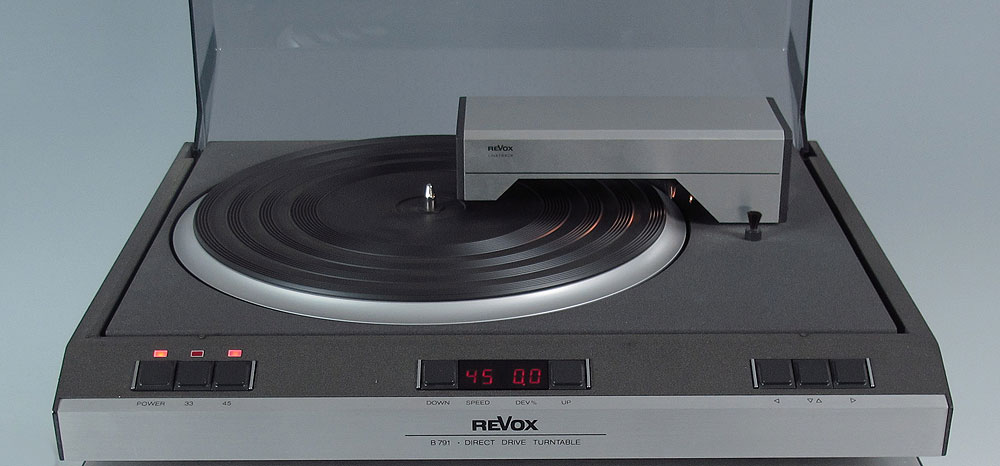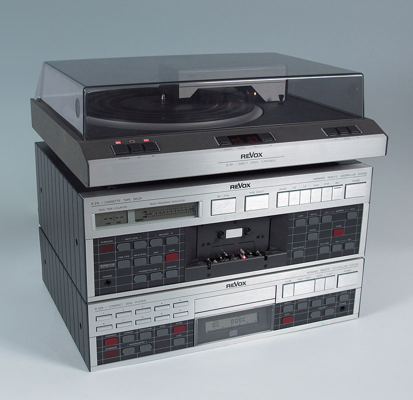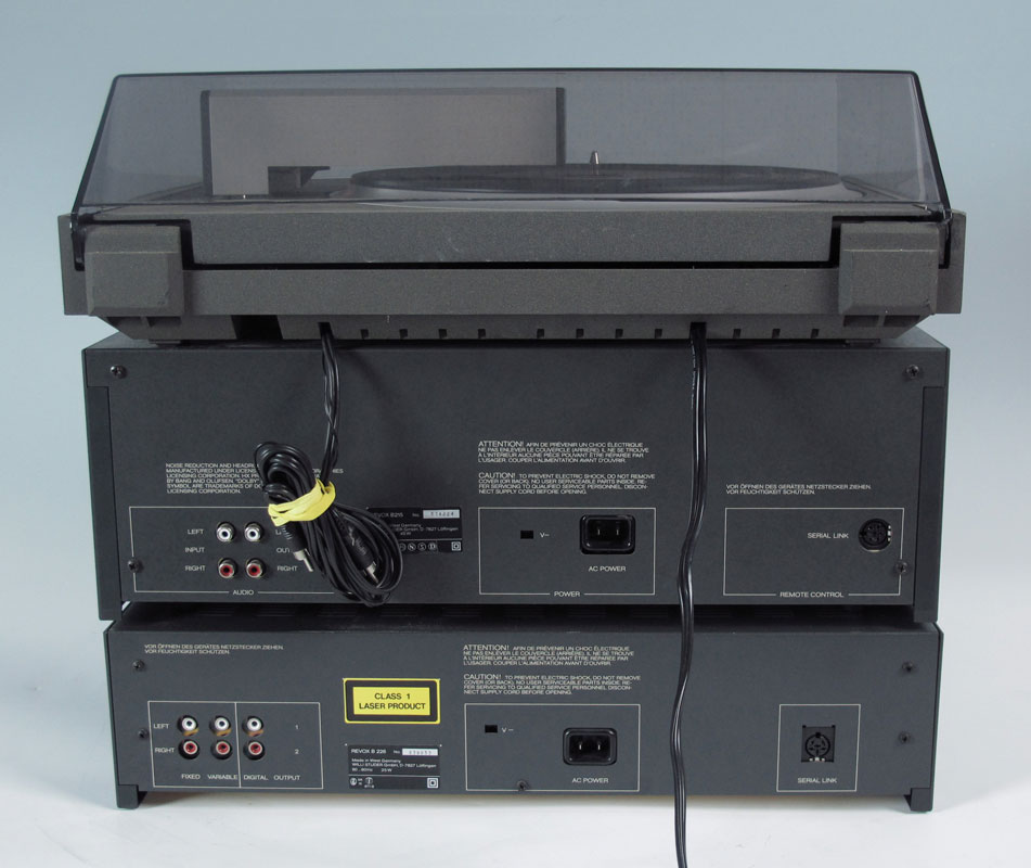 3 PIECE REVOX TURNTABLE, CD, CASSETTE: To include 1) Revox B791 Direct Drive Turntable. 5 3/4'' h. x 17 1/2'' x 15 1/2''. 2) B226 CD Player, 4 1/4'' h. x 17 3/4'' x 13 1/2''. 3) B215 cassette deck, 6'' h. x 17 3/4'' x 17 3/4'' x 13''