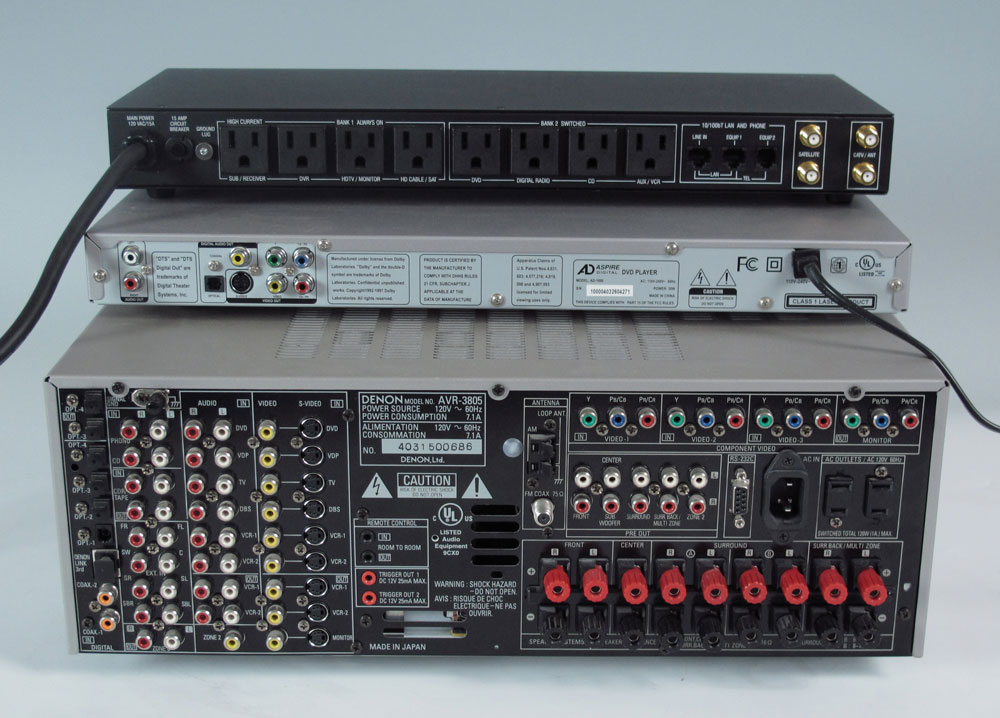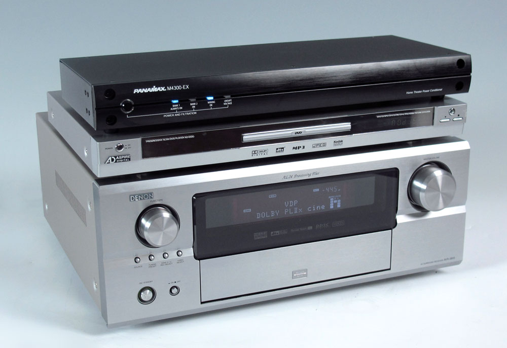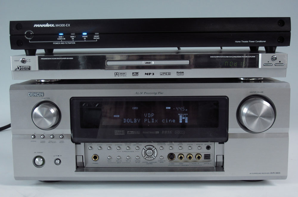 DENON AVR-3805 RECEIVER & ACCESSORIES: To include 1) Denon AL24 AVR-3805 Surround Sound receiver and remote, 6 3/4'' x 17'' x 16''. 2) Aspire AD-1000 DVD player, 1 3/4'' x 17'' x 11''. 3) Panamax M4300-EX power conditioner, 2 3/4'' x 17'' x 7''.