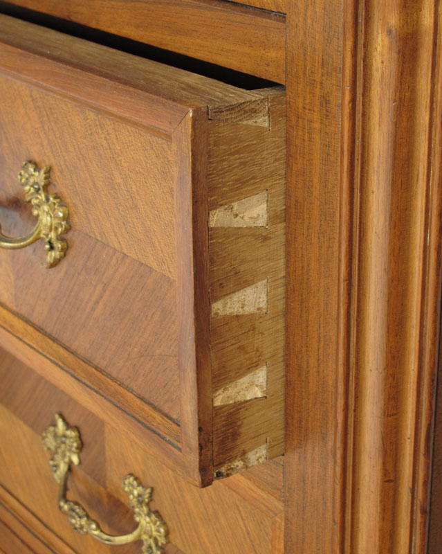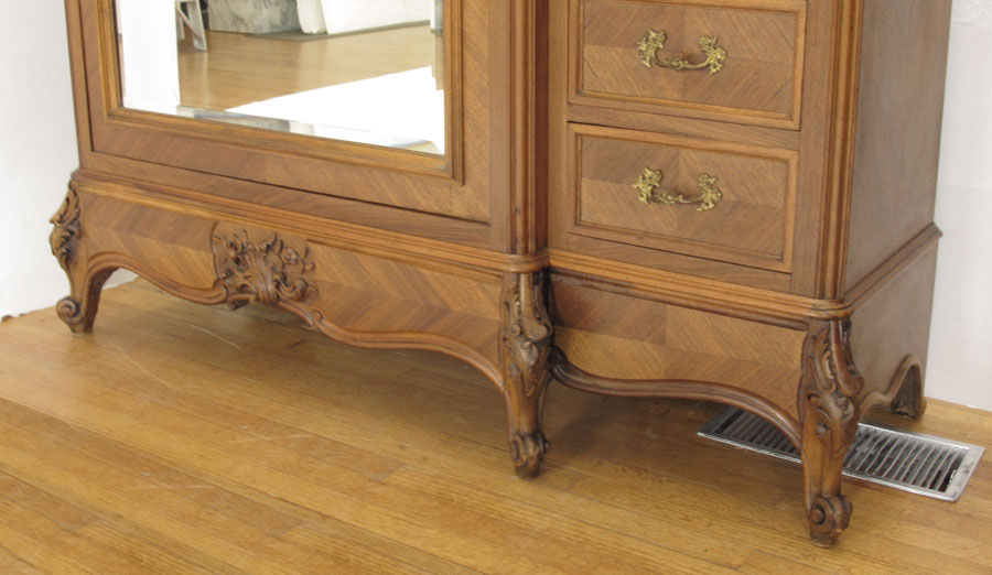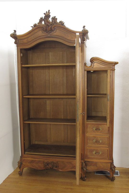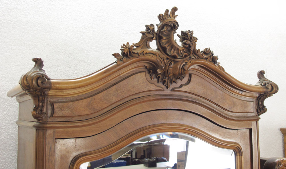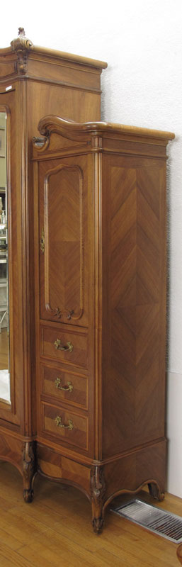 FRENCH WALNUT ARMOIRE: Carved crest over door with full length beveled mirror, 4 adjustable interior shelves. Right side single door over 3 drawers. 90'' h. x 59'' x 22''