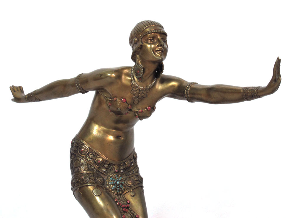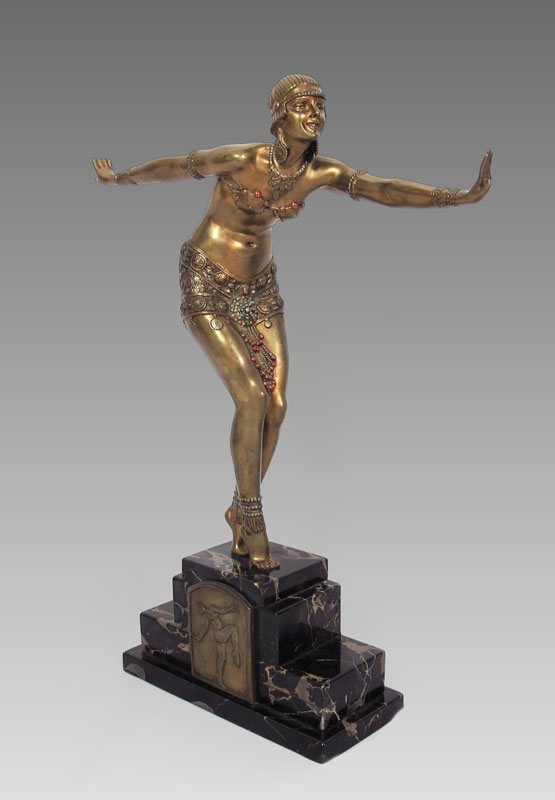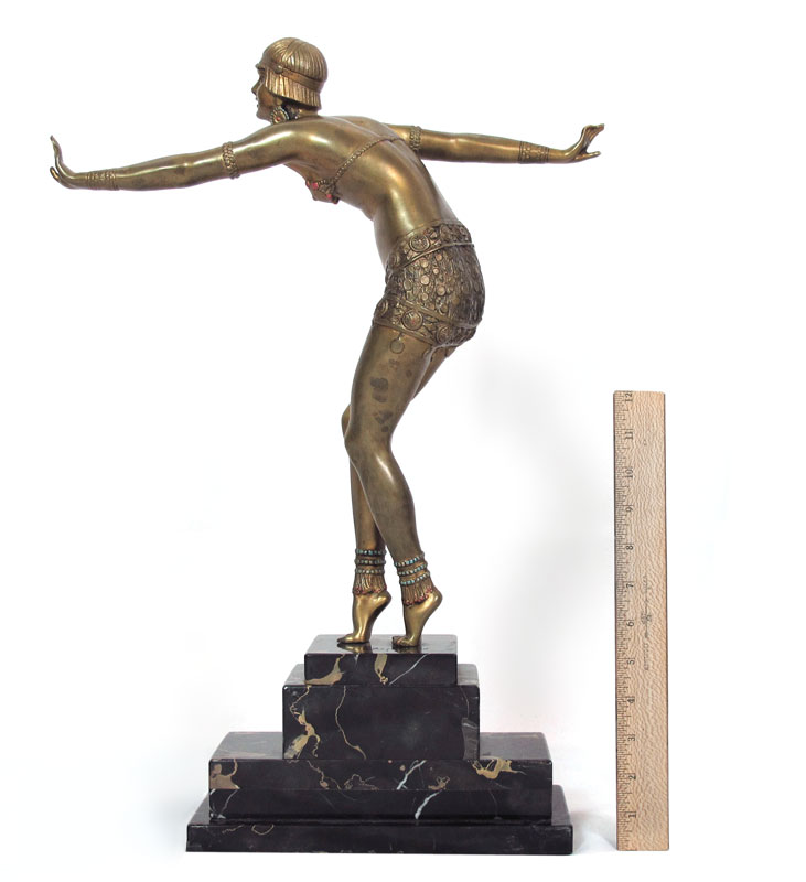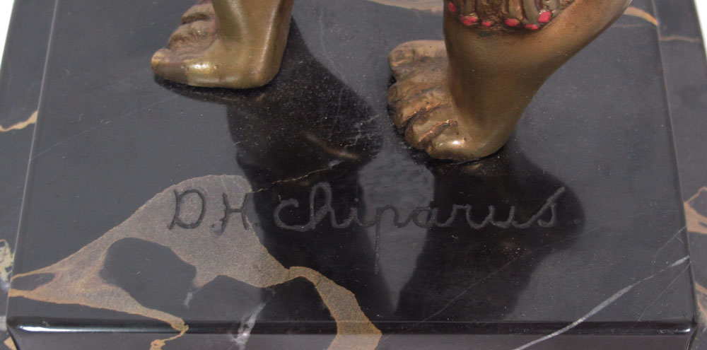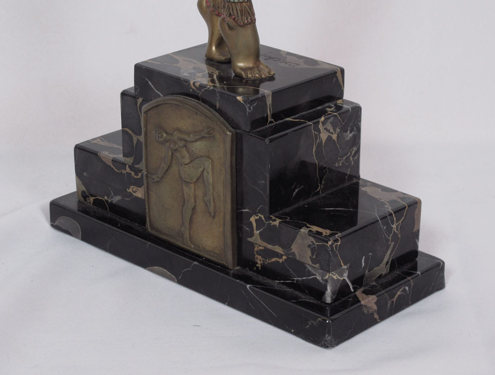 PHOENICIAN DANCER, PATINATED BRONZE AFTER CHIPARUS: Excellent caliber French restrike, circa 1930, 21 1/2'' h x 16'' w, incised signature to polished marble step plinth, 5 1/2''h x 6'' w, applied bronze plaque.