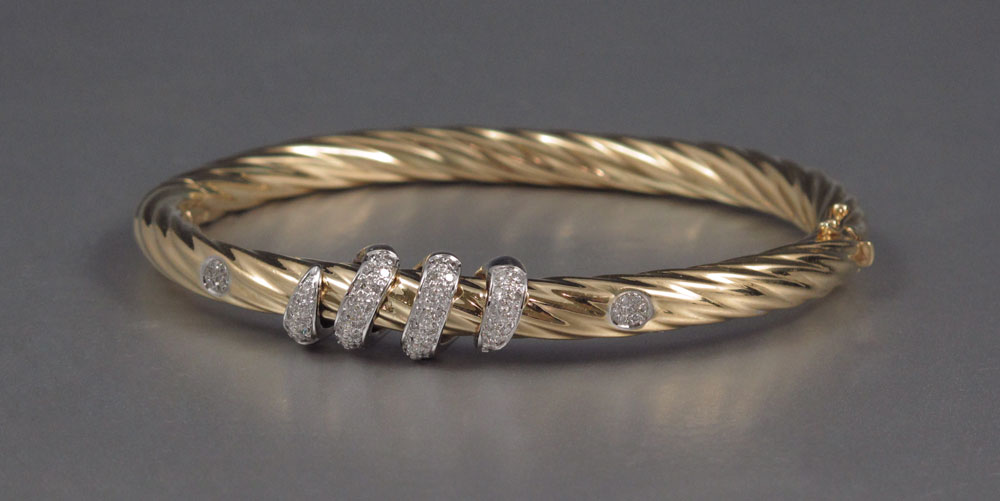18KT GOLD & DIAMOND TWIST BANGLE BRACELET: Yellow gold hinged bangle set with 68 round brilliant cut diamonds, approx. .60 ctw, G-H color VS clarity, pressure clasp and safety, 32.4 grams, interior 2 3/4'' x 2 1/8''. Sold with current Atlanta Gemological Lab. GIA appraisal, $5000 retail replacement value.