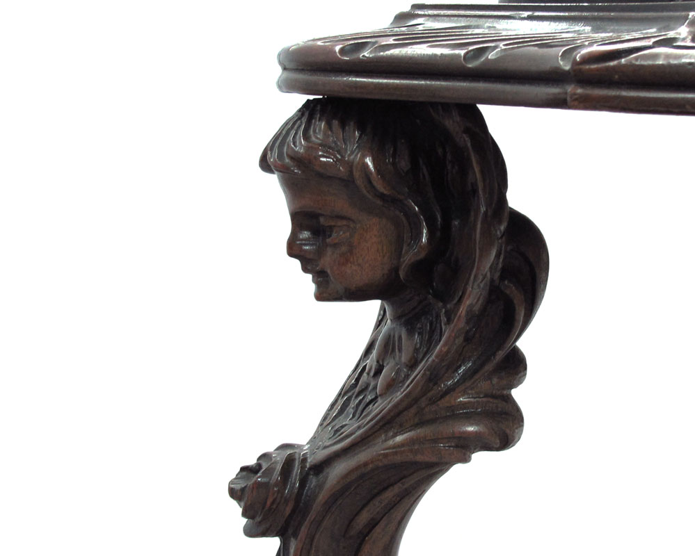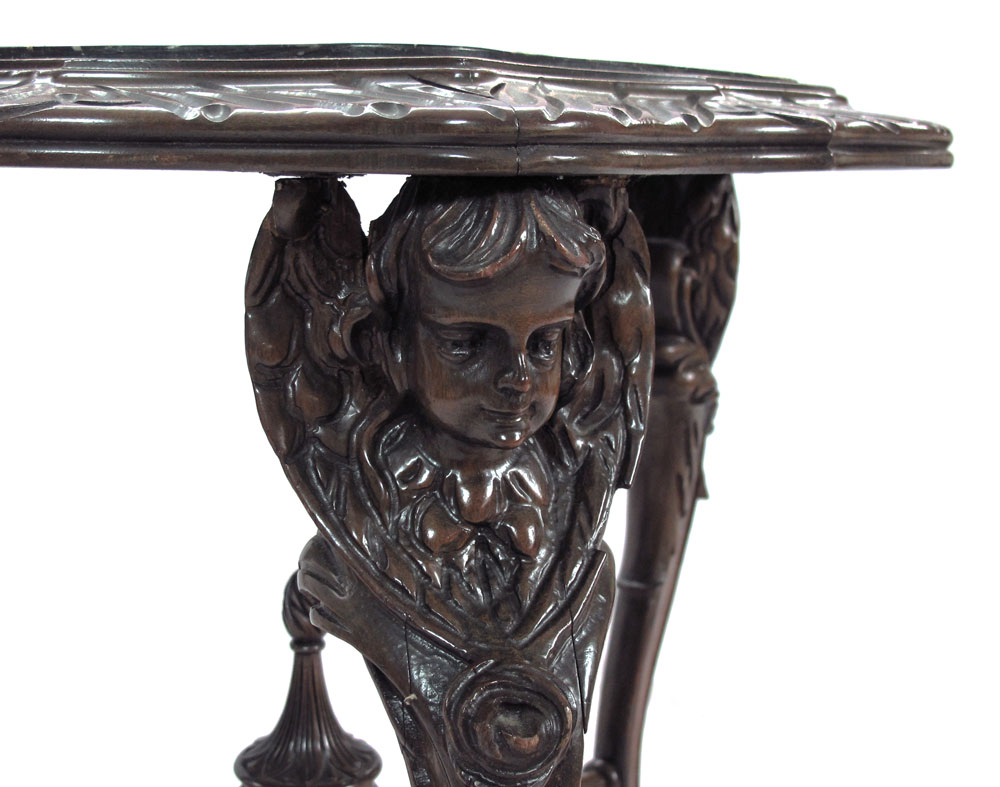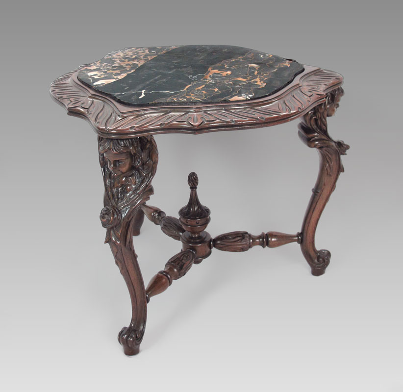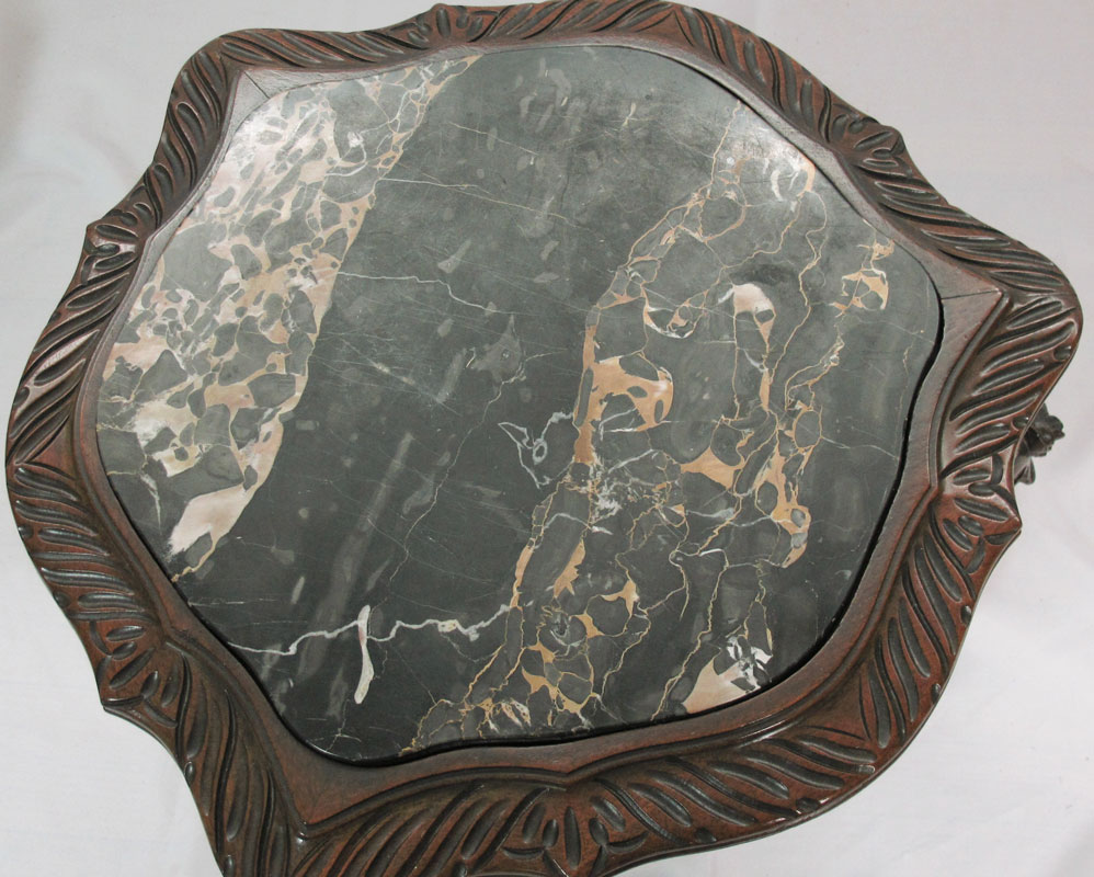 CHERUB CARVED MARBLE TOP SIDE TABLE: Carved cherubs on 3 legs, carved and turned stretcher. Removable marble insert. 18 1/4'' h. x 22 1/2'' x 21 1/2''.
