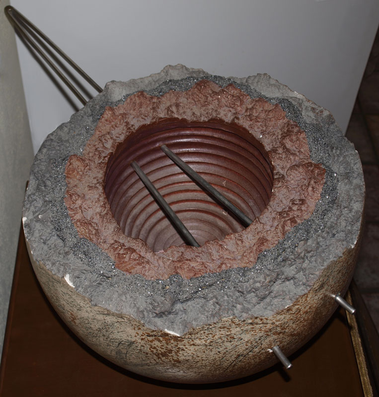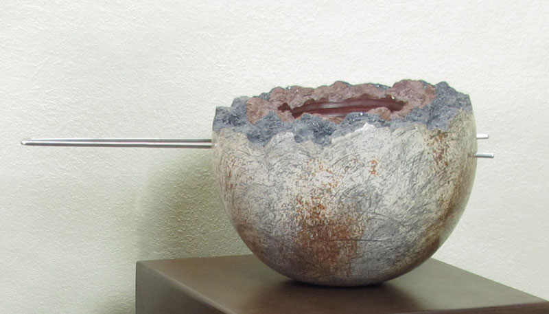MICK, Michael, (American, 20th Century): Geode with Steel Bar Pierced Through, Ceramic and Metal sculpture, 12'' h x31'' w, signed and dated 1995 on base.