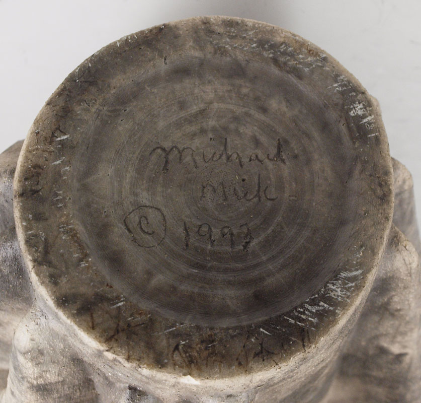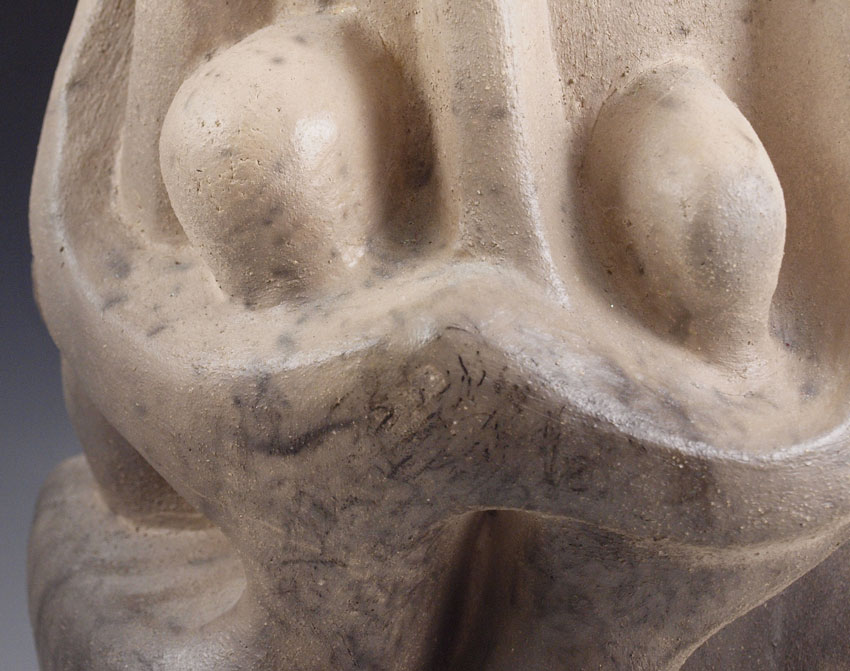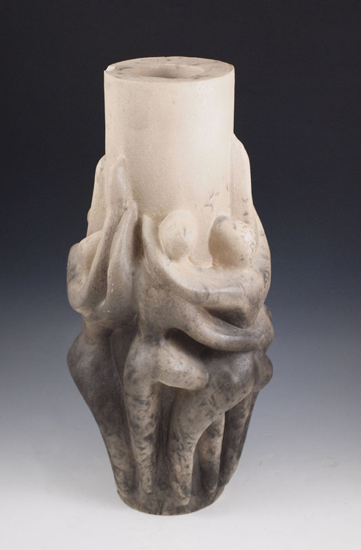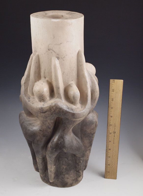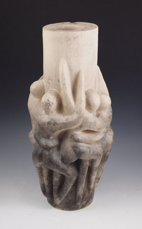 MICK, Michael, (American, 20th Century): Nudes Embracing a Phallic-like cylinder which is the vase, glazed pottery, incised signature on based, dated 1993, 18 1/2'' h x 9'' d.